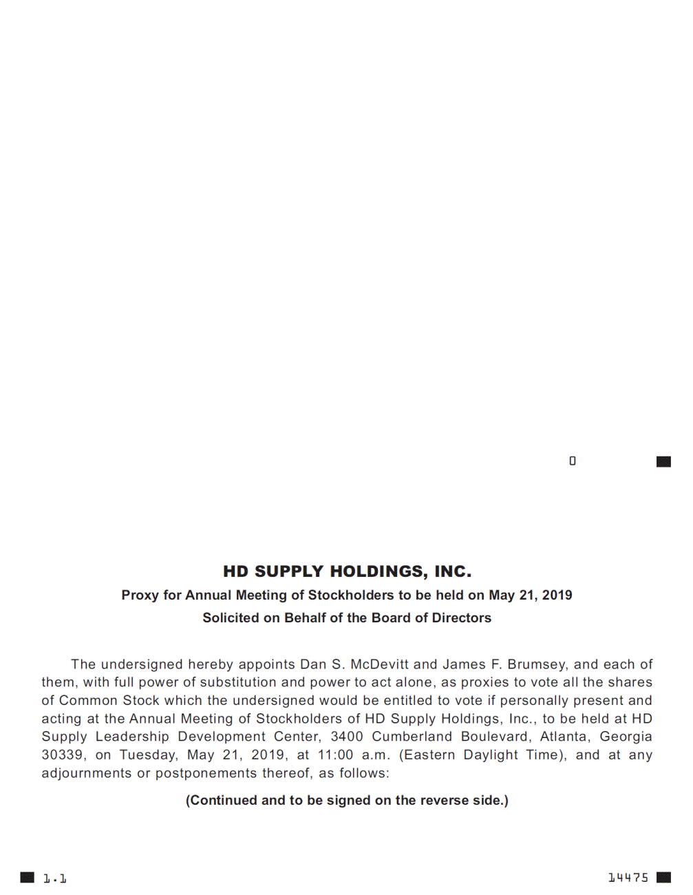 - 0 HD SUPPLY HOLDINGS, INC. Proxy for Annual Meeting of Stockholders to be held on May 21, 2019 Solicited on Behalf of the Board of Directors The undersigned hereby appoints Dan S. McDevitt and James F. Brumsey, and each of them, with full power of substitution and power to act alone, as proxies to vote all the shares of Common Stock which the undersigned would be entitled to vote if personally present and acting at the Annual Meeting of Stockholders of HD Supply Holdings, Inc., to be held at HD Supply Leadership Development Center, 3400 Cumberland Boulevard, Atlanta, Georgia 30339, on Tuesday, May 21, 2019, at 11:00 a.m. (Eastern Daylight Time), and at any adjournments or postponements thereof, as follows: (Continued and to be signed on the reverse side.) 14475 1.1