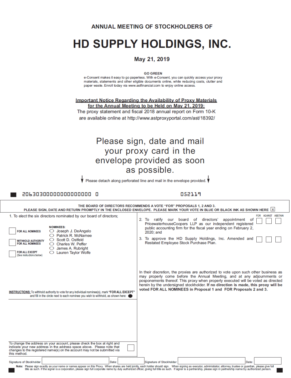 ANNUAL MEETING OF STOCKHOLDERS OF HD SUPPLY HOLDINGS, INC. May 21, 2019 GO GREEN e-Consent makes it easy to go paperless. With e-Consent, you can quickly access your proxy materials, statements and other eligible documents online, while reducing costs, clutter and paper waste. Enroll today via www.astfinancial.com to enjoy online access. Important Notice Regarding the Availability of Proxy Materials for the Annual Meeting to be Held on May 21, 2019: The proxy statement and fiscal 2018 annual report on Form 10-K are available online at http://www.astproxyportal.com/ast/18392/ Please sign, date and mail your proxy card in the envelope provided as soon as possible. Please detach along perforated line and mail in the envelope provided. 20630300000000000000 0 052119 2. To ratifyour board of directors’ appointment of public accounting firm for the fiscal year ending on February 2, Restated Employee Stock Purchase Plan. (See instructions below) changes to the registered name(s) on the account may not be submitted via Note: Please sign exactly as your name or names appear on this Proxy. When shares are held jointly, each holder should sign. When signing as executor, administrator, attorney, trustee or guardian, please give full title as such. If the signer is a corporation, please sign full corporate name by duly authorized officer, giving full title as such. If signer is a partnership, please sign in partnership name by authorized person. THE BOARD OF DIRECTORS RECOMMENDS A VOTE “FOR” PROPOSALS 1, 2 AND 3. PLEASE SIGN, DATE AND RETURN PROMPTLY IN THE ENCLOSED ENVELOPE. PLEASE MARK YOUR VOTE IN BLUE OR BLACK INK AS SHOWN HERE x 1. To elect the six directors nominated by our board of directors; NOMINEES: FOR ALL NOMINEESO Joseph J. DeAngelo O Patrick R. McNamee WITHHOLD AUTHORITYO Scott D. Ostfeld FOR ALL NOMINEESO Charles W. Peffer O James A. Rubright FOR ALL EXCEPTO Lauren Taylor Wolfe INSTRUCTIONS: To withhold authority to vote for any individual nominee(s), mark “FOR ALL EXCEPT” and fill in the circle next to each nominee you wish to withhold, as shown here: FOR AGAINST ABSTAIN PricewaterhouseCoopers LLP as our independent registered 2020; and 3. To approve the HD Supply Holdings, Inc. Amended and In their discretion, the proxies are authorized to vote upon such other business as may properly come before the Annual Meeting, and at any adjournments or posponements thereof. This proxy when properly executed will be voted as directed herein by the undersigned stockholder. If no direction is made, this proxy will be voted FOR ALL NOMINEES in Proposal 1 and FOR Proposals 2 and 3. To change the address on your account, please check the box at right and indicate your new address in the address space above. Please note that this method. Signature of Stockholder Date: Signature of StockholderDate: