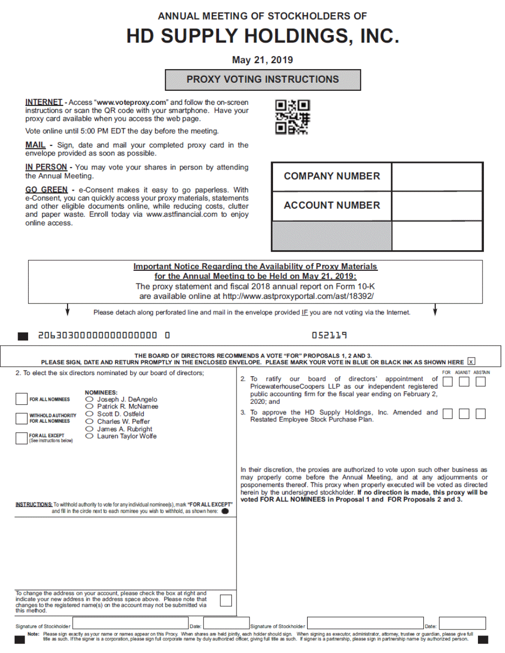 ANNUAL MEETING OF STOCKHOLDERS OF HD SUPPLY HOLDINGS, May 21, 2019 INC. INTERNET - Access “www.voteproxy.com” and follow the on-screen instructions or scan the QR code with your smartphone. Have your proxy card available when you access the web page. Vote online until 5:00 PM EDT the day before the meeting. MAIL - Sign, date and mail your completed proxy card in the envelope provided as soon as possible. IN PERSON - You may vote your shares in person by attending the Annual Meeting. GO GREEN - e-Consent makes it easy to go paperless. With e-Consent, you can quickly access your proxy materials, statements and other eligible documents online, while reducing costs, clutter and paper waste. Enroll today via www.astfinancial.com to enjoy online access. Please detach along perforated line and mail in the envelope provided IF you are not voting via the Internet. 20630300000000000000 0 052119 2. To ratifyour board of directors’appointment of public accounting firm for the fiscal year ending on February 2, Restated Employee Stock Purchase Plan. (See instructions below) changes to the registered name(s) on the account may not be submitted via Note: Please sign exactly as your name or names appear on this Proxy. When shares are held jointly, each holder should sign. When signing as executor, administrator, attorney, trustee or guardian, please give full title as such. If the signer is a corporation, please sign full corporate name by duly authorized officer, giving full title as such. If signer is a partnership, please sign in partnership name by authorized person. THE BOARD OF DIRECTORS RECOMMENDS A VOTE “FOR” PROPOSALS 1, 2 AND 3. PLEASE SIGN, DATE AND RETURN PROMPTLY IN THE ENCLOSED ENVELOPE. PLEASE MARK YOUR VOTE IN BLUE OR BLACK INK AS SHOWN HERE x 2. To elect the six directors nominated by our board of directors; NOMINEES: FOR ALL NOMINEESO Joseph J. DeAngelo O Patrick R. McNamee WITHHOLD AUTHORITYO Scott D. Ostfeld FOR ALL NOMINEESO Charles W. Peffer O James A. Rubright FOR ALL EXCEPTO Lauren Taylor Wolfe INSTRUCTIONS: To withhold authority to vote for any individual nominee(s), mark “FOR ALL EXCEPT” and fill in the circle next to each nominee you wish to withhold, as shown here: FOR AGAINST ABSTAIN PricewaterhouseCoopers LLP as our independent registered 2020; and 3. To approve the HD Supply Holdings, Inc. Amended and In their discretion, the proxies are authorized to vote upon such other business as may properly come before the Annual Meeting, and at any adjournments or posponements thereof. This proxy when properly executed will be voted as directed herein by the undersigned stockholder. If no direction is made, this proxy will be voted FOR ALL NOMINEES in Proposal 1 and FOR Proposals 2 and 3. To change the address on your account, please check the box at right and indicate your new address in the address space above. Please note that this method. Signature of Stockholder Date: Signature of StockholderDate: Important Notice Regarding the Availability of Proxy Materials for the Annual Meeting to be Held on May 21, 2019: The proxy statement and fiscal 2018 annual report on Form 10-K are available online at http://www.astproxyportal.com/ast/18392/ COMPANY NUMBER ACCOUNT NUMBER PROXY VOTING INSTRUCTIONS