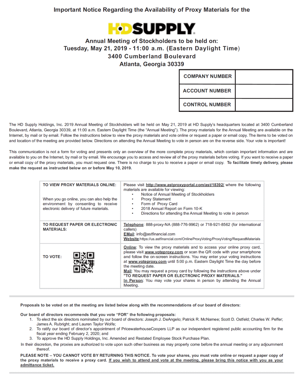 Important Notice Regarding the Availability of Proxy Materials for the Annual Meeting of Stockholders to be held on: Tuesday, May 21, 2019 - 11:00 a.m. (Eastern Daylight Time) 3400 Cumberland Boulevard Atlanta, Georgia 30339 The HD Supply Holdings, Inc. 2019 Annual Meeting of Stockholders will be held on May 21, 2019 at HD Supply’s headquarters located at 3400 Cumberland Boulevard, Atlanta, Georgia 30339, at 11:00 a.m. Eastern Daylight Time (the “Annual Meeting”). The proxy materials for the Annual Meeting are available on the Internet, by mail or by email. Follow the instructions below to view the proxy materials and vote online or request a paper or email copy. The items to be voted on and location of the meeting are provided below. Directions on attending the Annual Meeting to vote in person are on the reverse side. Your vote is important! This communication is not a form for voting and presents only an overview of the more complete proxy materials, which contain important information and are available to you on the Internet, by mail or by email. We encourage you to access and review all of the proxy materials before voting. If you want to receive a paper or email copy of the proxy materials, you must request one. There is no charge to you to receive a paper or email copy. make the request as instructed below on or before May 10, 2019. To facilitate timely delivery, please Proposals to be voted on at the meeting are listed below along with the recommendations of our board of directors: Our board of directors recommends that you vote “FOR” the following proposals: 1. To elect the six directors nominated by our board of directors: Joseph J. DeAngelo; Patrick R. McNamee; Scott D. Ostfeld; Charles W. Peffer; James A. Rubright; and Lauren Taylor Wolfe; To ratify our board of director’s appointment of PricewaterhouseCoopers LLP as our independent registered public accounting firm for the fiscal year ending February 2, 2020; and To approve the HD Supply Holdings, Inc. Amended and Restated Employee Stock Purchase Plan. 2. 3. In their discretion, the proxies are authorized to vote upon such other business as may properly come before the annual meeting or any adjournment thereof. PLEASE NOTE – YOU CANNOT VOTE BY RETURNING THIS NOTICE. To vote your shares, you must vote online or request a paper copy of the proxy materials to receive a proxy card. If you wish to attend and vote at the meeting, please bring this notice with you as your admittance ticket. TO VIEW PROXY MATERIALS ONLINE: When you go online, you can also help the environment by consenting to receive electronic delivery of future materials. Please visit http://www.astproxyportal.com/ast/18392/ where the following materials are available for viewing: •Notice of Annual Meeting of Stockholders •Proxy Statement •Form of Proxy Card •2018 Annual Report on Form 10-K •Directions for attending the Annual Meeting to vote in person TO REQUEST PAPER OR ELECTRONIC MATERIALS: Telephone: 888-proxy-NA (888-776-9962) or 718-921-8562 (for international callers) EMail: info@astfinancial.com Website:https://us.astfinancial.com/OnlineProxyVoting/ProxyVoting/RequestMaterials TO VOTE: Online: To view the proxy materials and to access your online proxy card, please visit www.voteproxy.com or scan the QR code with your smartphone and follow the on-screen instructions. You may enter your voting instructions at www.voteproxy.com until 5:00 p.m. Eastern Daylight Time the day before the meeting date. Mail: You may request a proxy card by following the instructions above under "TO REQUEST PAPER OR ELECTRONIC PROXY MATERIALS." In Person: You may vote your shares in person by attending the Annual Meeting. COMPANY NUMBER ACCOUNT NUMBER CONTROL NUMBER