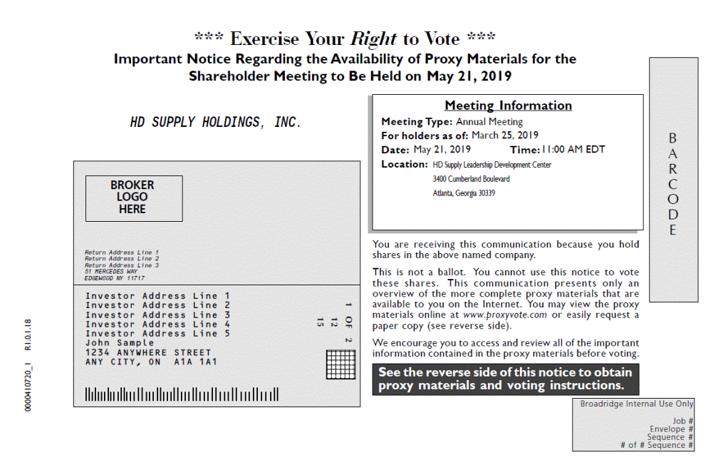 *** Exercise Your Right to Vote *** Important Notice Regarding the Availability of Proxy Materials for the Shareholder Meeting to Be Held on May 21, 2019 HD SUPPLY HOLDINGS, INC. Date: May 21, 2019 Time: 11:00 AM EDT You are receiving this communication because you hold shares in the above named company. This is not a ballot. You cannot use this notice to vote these shares. This communication presents only an overview of the more complete proxy materials that are available to you on the Internet. You may view the proxy materials online at www.proxyvote.com or easily request a paper copy (see reverse side). We encourage you to access and review all of the important information contained in the proxy materials before voting. Envelope # # of # Sequence # 1 OF 2 12 15 0000410720_1 R1.0.1.18 Broadridge Internal Use Only Job # Sequence # See the reverse side of this notice to obtain proxy materials and voting instructions. LOGO Return Address Line 1 Return Address Line 2 Return Address Line 3 51 MERCEDES WAY EDGEWOOD NY 11717 Investor Address Line 1 Investor Address Line 2 Investor Address Line 3 Investor Address Line 4 Investor Address Line 5 John Sample 1234 ANYWHERE STREET ANY CITY, ONA1A 1A1 1234567 1234567 1234567 1234567 1234567 1234567 BROKER HERE Meeting Information Meeting Type: Annual Meeting For holders as of: March 25, 2019 Location: HD Supply Leadership Development Center 3400 Cumberland Boulevard Atlanta, Georgia 30339 B A R C O D E
