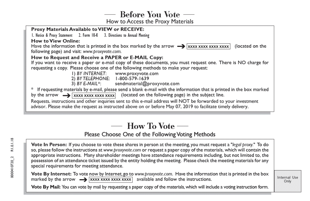 Before You Vote How to Access the Proxy Materials Proxy Materials Available to VIEW or RECEIVE: Have the information that is printed in the box marked by the arrow (located on the by the arrow (located on the following page) in the subject line. How To Vote Please Choose One of the Following Voting Methods Only Vote By Mail: You can vote by mail by requesting a paper copy of the materials, which will include a voting instruction form. 0000410720_2 R1.0.1.18 Vote In Person: If you choose to vote these shares in person at the meeting, you must request a "legal proxy." To do so, please follow the instructions at www.proxyvote.com or request a paper copy of the materials, which will contain the appropriate instructions. Many shareholder meetings have attendance requirements including, but not limited to, the possession of an attendance ticket issued by the entity holding the meeting. Please check the meeting materials for any special requirements for meeting attendance. Vote By Internet: To vote now by Internet, go to www.proxyvote.com. Have the information that is printed in the box marked by the arrow available and follow the instructions. Internal Use 1. Notice & Proxy Statement2. Form 10-K3. Directions to Annual Meeting How to View Online: following page) and visit: www.proxyvote.com. How to Request and Receive a PAPER or E-MAIL Copy: If you want to receive a paper or e-mail copy of these documents, you must request one. There is NO charge for requesting a copy. Please choose one of the following methods to make your request: 1) BY INTERNET: www.proxyvote.com 2) BY TELEPHONE: 1-800-579-1639 3) BY E-MAIL*: sendmaterial@proxyvote.com * If requesting materials by e-mail, please send a blank e-mail with the information that is printed in the box marked Requests, instructions and other inquiries sent to this e-mail address will NOT be forwarded to your investment advisor. Please make the request as instructed above on or before May 07, 2019 to facilitate timely delivery.