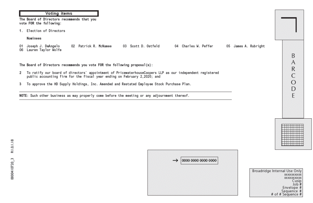 The Board of Directors recommends that you vote FOR the following: 1. Election of Directors Nominees Joseph J. DeAngelo Lauren Taylor Wolfe 01 06 02 Patrick R. McNamee 03 Scott D. Ostfeld 04 Charles W. Peffer 05 James A. Rubright The Board of Directors recommends you vote FOR the following proposal(s): 2To ratify our board of directors` appointment of PricewaterhouseCoopers LLP as our independent registered public accounting firm for the fiscal year ending on February 2,2020; and 3To approve the HD Supply Holdings, Inc. Amended and Restated Employee Stock Purchase Plan. NOTE: Such other business as may properly come before the meeting or any adjournment thereof. xxxxxxxxxx Cusip Envelope # # of # Sequence # 0000410720_3 R1.0.1.18 Broadridge Internal Use Only xxxxxxxxxx Job # Sequence # B A R C O D E 23456789012 2 2 2 2 12345678901 12345678901 12345678901 12345678901 12345678901 12345678901 12345678901 12345678901 12345678901 12345678901 Voting items