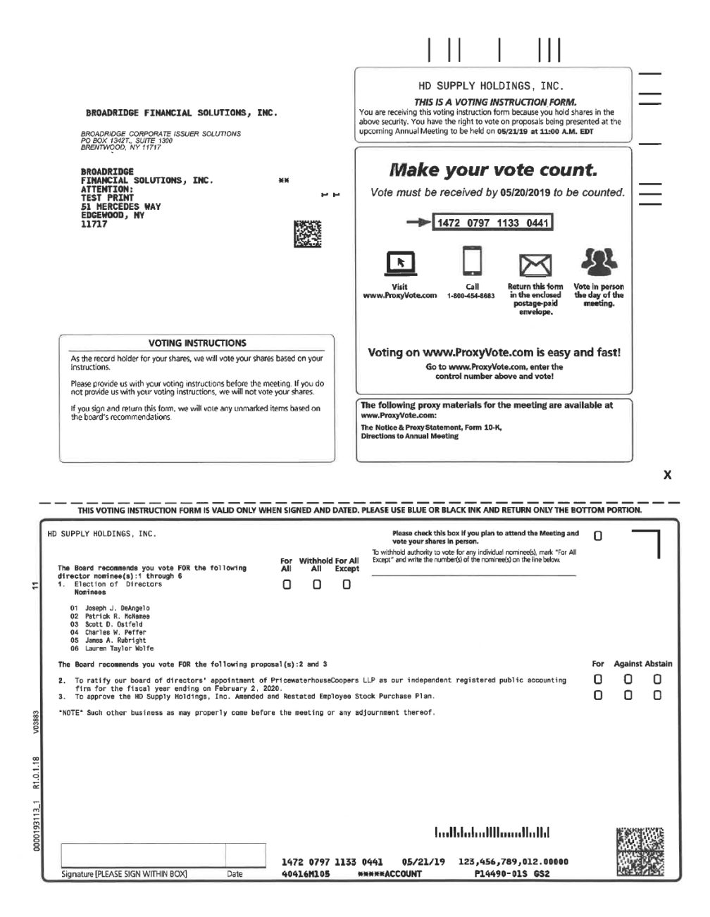 I II Ill HD SUPPLY HOLDINGS, INC. THIS IS A VOTING INSTRUCTION. FORM. You are receiving this voting instruction form because you hold shares in the above security. You have the right to vote on proposals being presented at the upcoming Annuol Meeting to be held on 05121119 at 11:00 A.M. EDT BROADRIDGE FINANCIAL SOLUTIONS, INC. BROADRIDGE CORPORATE ISSUER SOLUTIONS PO BOX 1342T., SUITE 1300 BRENTWOOD, NY 11717 Make your vote count. Vote must be received by 05/20/2019 to be counted. BROADRIDGE •• FINANCIAL SOLUTIONS, INC. ATTENTION: TEST PRINT 51 HERCEDES WAY EDGEWOOD1 NY 11717 .....h472 0797 1133 0441! -m D SJ.l. 181 Call Return this form Vote In person Visit in the enclosed portage-paid envelope. the day of the meeting. www.ProxyVote.com 1-800-454-8683 VOTING INSTRUCTIONS Voting on www.ProxyVote.com is easy and fast! Go to www.ProxyVote.com.enter the control number above and vote! As the record holder for your shares, we will vote your shares based on your instructions. Please provide us with your voting instructions before the meeting. If you do not provide us with your voting instructions. we will not vote your shares. If you sign and return this form, we will vole any unmarked items based on the board's recommendations. X THIS VOTING INSTRUCTION FORM IS VAUD ONLY WHEN SIGNED AND DATED.PLEASE USE BLUE OR BLACK INK AND RETURN ONLY THE BOTTOM PORTION. vote your shares In person. Except" and write the number(s) of the nominee(s) on the line below. For Withhold For All ... 1. El ect1 on of 01 rectors Nominees firm for the fiscal year ending on February 2, 2020. &l "' 00 0 I IT1 HD SUPPLY HOLDINGS, INC.Please check this box If you plan to attend the Meeting and 0 To withhold authority to vote for any individual nominee(s), mark "For All The Board reco11mends you vote FOR the followingAllAllExcept director nominee(s) :1 through 6 0 0 0 01 Joseph J . DeAnge1 o 02 Patr1ck R. HcNamee 03 Scott D. Ostfeld 04 Charles W. Peffer 05 James A. Rubright 06 Lauren Taylor Wolfe The Board recommends you vote FOR the following proposal (s) :2 and 3 For Against Abstain 2. To ratify our board of directors' appointment of Pr1cewaterhouseCoopers LLP as our independent registered public accounting0 0 0 3. To approve the HD Supply Holdings, Inc. Amended and Restated Employee Stock Purchase Plan. 0 00 •NoTE• Such other business as may properly come before the meeting or any adjournment thereof. l•••ll.l..l...llllm•nll•• ll.l 1472 0797 1133 044105/21/19 123,4§6,789,012.00000 Signature [PLEASE SIGN WITHIN BOX]Dote40416Hl05•••••ACCOUNTPl4490-0lS GS2 The following proxy materials for the meeting are available at www.ProxyVote.com: The Notice & Proxy Statement, Form 10-K, Directions to Annual Meeting