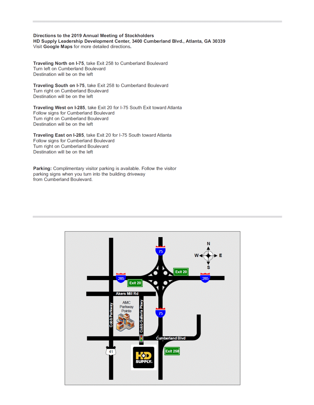 Directions to the 2019 Annual Meeting of Stockholders HD Supply Leadership Development Center, 3400 Cumberland Blvd., Atlanta, GA 30339 Visit Google Maps for more detailed directions. Traveling North on I-75, take Exit 258 to Cumberland Boulevard Turn left on Cumberland Boulevard Destination will be on the left Traveling South on I-75, take Exit 258 to Cumberland Boulevard Turn right on Cumberland Boulevard Destination will be on the left Traveling West on I-285, take Exit 20 for I-75 South Exit toward Atlanta Follow signs for Cumberland Boulevard Turn right on Cumberland Boulevard Destination will be on the left Traveling East on I-285, take Exit 20 for I-75 South toward Atlanta Follow signs for Cumberland Boulevard Turn right on Cumberland Boulevard Destination will be on the left Parking: Complimentary visitor parking is available. Follow the visitor parking signs when you turn into the building driveway from Cumberland Boulevard.