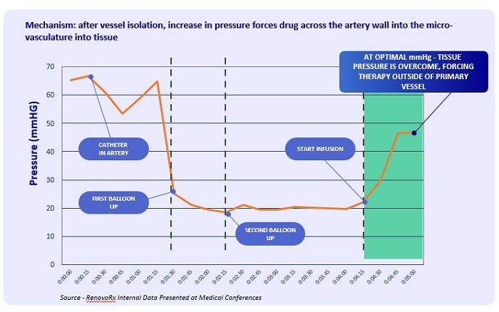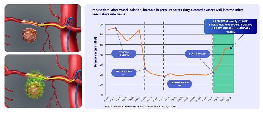 RenovoCath utilizes our patented Trans-Arterial Micro-Perfusion (TAMP™) therapy platform, which is designed to ensure precise therapeutic delivery across the arterial wall near the target tumor site to bathe the tumor, while potentially minimizing a therapy’s toxicities versus systemic intravenous (or IV) therapy, including traditional chemotherapy. Our novel approach to targeted treatment offers the potential for increased safety, tolerance, and improved efficacy. RenovoCath is indicated for temporary vessel occlusion in applications including arteriography, preoperative occlusion, and chemotherapeutic drug infusion.