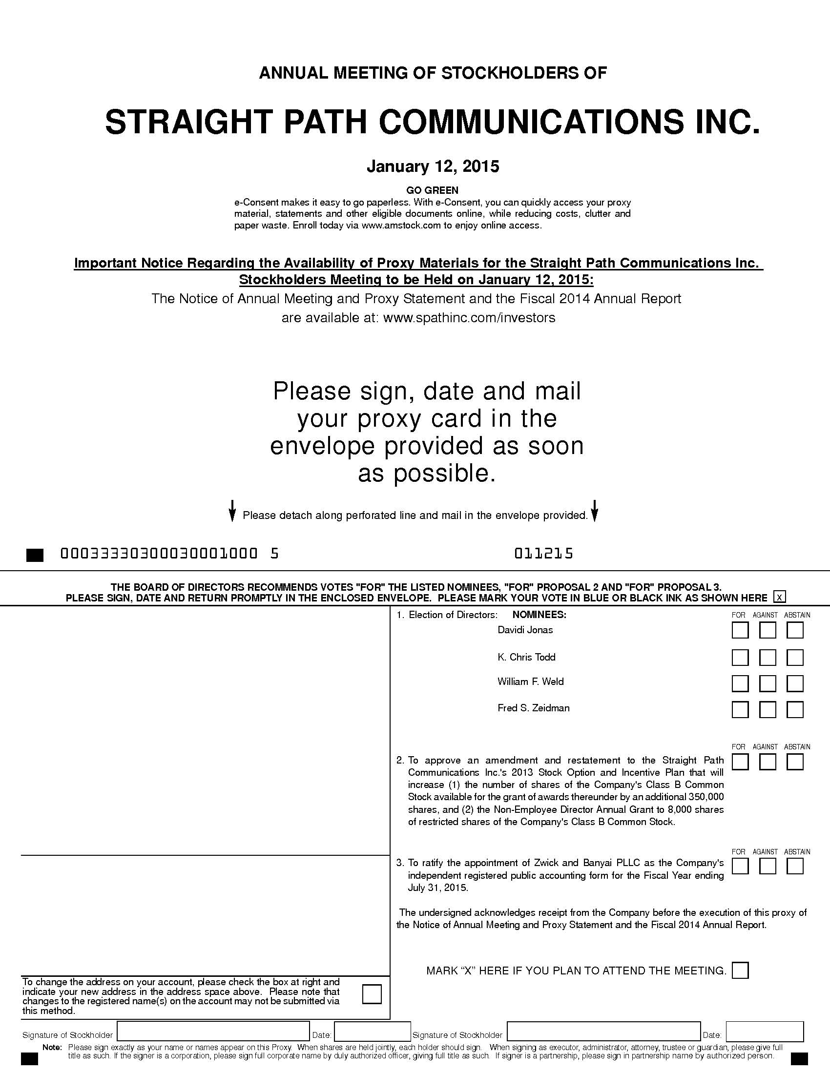 ANNUAL MEETINGOF STOCKHOLDERS OF STRAIGHT PATH COMMUNICATIONS INC. January 12, 2015 Important Notice Regarding the Availability of Proxy Materials for the Straight Path Communications Inc. Stockholders Meeting to be Held on January 12, 2015: The Notice of Annual Meeting and Proxy Statement and the Fiscal 2014 Annual Report are available at: www.spathinc.com/investors Please sign, date and mail your proxy card in the envelope provided as soon as possible. Signature of Stockholder Date: Signature of Stockholder Date: Note: Please sign exactly as your name or names appear on this Proxy. When shares are held jointly, each holder should sign. When signing as executor, administrator, attorney, trustee or guardian, please give full title as such. If the signer is a corporation, please sign full corporate name by duly authorized officer, giving full title as such. If signer is a partnership, please sign in partnership name by authorized person. To change the address on your account, please check the box at right and indicate your new address in the address space above. Please note that changes to the registered name(s) on the account may not be submitted via this method. 1. Election of Directors: O Eric F. Cosentino O James A. Courter O Howard S. Jonas O James R. Mellor O Judah Schorr 1. Election of Directors: NOMINEES: Davidi Jonas K. Chris Todd William F. Weld Fred S. Zeidman 2. To approve an amendment and restatement to the Straight Path Communications Inc.'s 2013 Stock Option and Incentive Plan that will increase (1) the number of shares of the Company's Class B Common Stock available for the grant of awards thereunder by an additional 350,000 shares, and (2) the Non-Employee Director Annual Grant to 8,000 shares of restricted shares of the Company's Class B Common Stock. 3. To ratify the appointment of Zwick and Banyai PLLC as the Company's independent registered public accounting form for the Fiscal Year ending July 31, 2015. The undersigned acknowledges receipt from the Company before the execution of this proxy of the Notice of Annual Meeting and Proxy Statement and the Fiscal 2014 Annual Report. FOR AGAINST ABSTAIN FOR ALL NOMINEES WITHHOLD AUTHORITY FOR ALL NOMINEES FOR ALL EXCEPT (See instructions below) INSTRUCTIONS: To withhold authority to vote for any individual nominee(s), mark “FOR ALL EXCEPT” and fill in the circle next to each nominee you wish to withhold, as shown here: NOMINEES: THE BOARD OF DIRECTORS RECOMMENDS VOTES "FOR" THE LISTED NOMINEES, "FOR" PROPOSAL 2 AND "FOR" PROPOSAL 3. PLEASE SIGN, DATE AND RETURN PROMPTLY IN THE ENCLOSED ENVELOPE. PLEASE MARK YOUR VOTE IN BLUE OR BLACK INK AS SHOWN HERE x --------------- Please detach along perforated line and mail in the envelope provided. ---------------- 00033330300030001000 5 011215 MARK “X” HERE IF YOU PLAN TO ATTEND THE MEETING. GO GREEN e-Consent makes it easy to go paperless. With e-Consent, you can quickly access your proxy material, statements and other eligible documents online, while reducing costs, clutter and paper waste. Enroll today via www.amstock.com to enjoy online access. FOR AGAINST ABSTAIN FOR AGAINST ABSTAIN