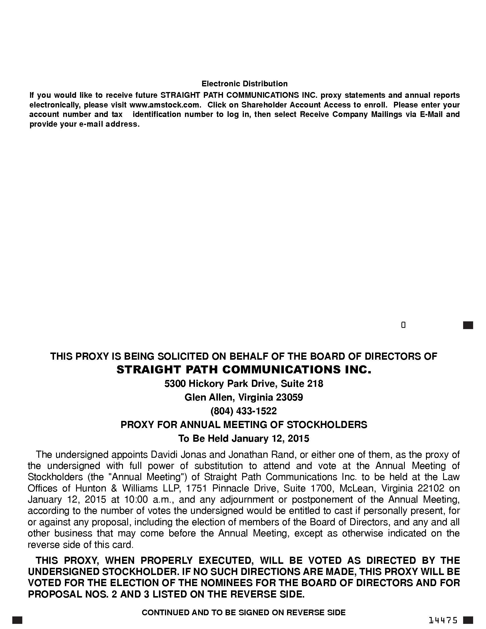 14475 THIS PROXY IS BEING SOLICITED ON BEHALF OF THE BOARD OF DIRECTORS OF STRAIGHT PATH COMMUNICATIONS INC. 5300 Hickory Park Drive, Suite 218 Glen Allen, Virginia 23059 (804) 433-1522 PROXY FOR ANNUAL MEETING OF STOCKHOLDERS To Be Held January 12, 2015 The undersigned appoints Davidi Jonas and Jonathan Rand, or either one of them, as the proxy of the undersigned with full power of substitution to attend and vote at the Annual Meeting of Stockholders (the "Annual Meeting") of Straight Path Communications Inc. to be held at the Law Offices of Hunton Williams LLP, 1751 Pinnacle Drive, Suite 1700, McLean, Virginia 22102 on January 12, 2015 at 10:00 a.m., and any adjournment or postponement of the Annual Meeting, according to the number of votes the undersigned would be entitled to cast if personally present, for or against any proposal, including the election of members of the Board of Directors, and any and all other business that may come before the Annual Meeting, except as otherwise indicated on the reverse side of this card. THIS PROXY, WHEN PROPERLY EXECUTED, WILL BE VOTED AS DIRECTED BY THE UNDERSIGNED STOCKHOLDER. IF NO SUCH DIRECTIONS ARE MADE, THIS PROXY WILL BE VOTED FOR THE ELECTION OF THE NOMINEES FOR THE BOARD OF DIRECTORS AND FOR PROPOSAL NOS. 2 AND 3 LISTED ON THE REVERSE SIDE. CONTINUED AND TO BE SIGNED ON REVERSE SIDE Electronic Distribution If you would like to receive future STRAIGHT PATH COMMUNICATIONS INC. proxy statements and annual reports electronically, please visit www.amstock.com. Click on Shareholder Account Access to enroll. Please enter your account number and tax identification number to log in, then select Receive Company Mailings via E-Mail and provide your e-mail address.