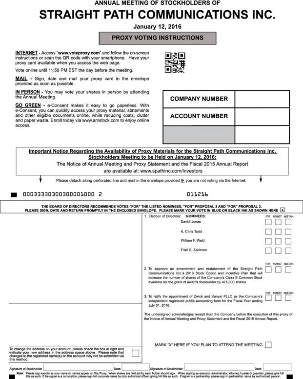 1. To elect four directors, each for a term of one year. 2. To approve an amendment and restatement of the Straight Path Communications Inc.’s 2013 Stock Option and Incentive Plan that will increase the number of shares of the Company’s Class B Common Stock available for the grant of awards thereunder by 475,000 shares. 3. To ratify the appointment of Zwick & Banyai, PLLC as the Company’s independent registered public accounting firm for the Fiscal Year ending July 31, 2016. 4. To transact other business as may properly come before the Annual Meeting and any adjournment or postponement thereof. |