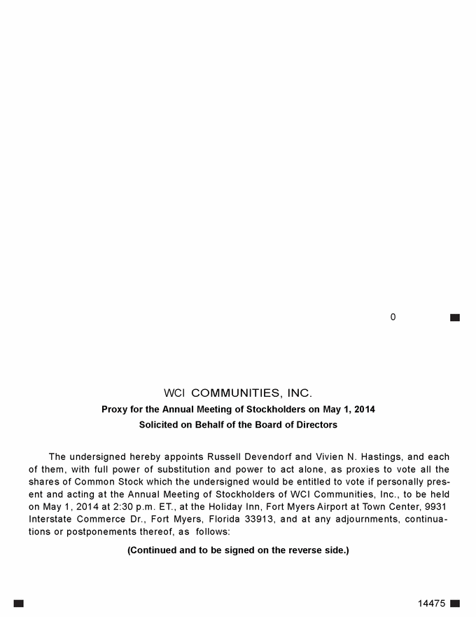 --------------- 0 WCI COMMUNITIES, INC. Proxy for the Annual Meeting of Stockholders on May 1, 2014 Solicited on Behalf of the Board of Directors The undersigned hereby appoints Russell Devendorf and Vivien N. Hastings, and each of them, with full power of substitution and power to act alone, as proxies to vote all the shares of Common Stock which the undersigned would be entitled to vote if personally pres- ent and acting at the Annual Meeting of Stockholders of WCI Communities, Inc., to be held on May 1, 2014 at 2:30 p.m. ET., at the Holiday Inn, Fort Myers Airport at Town Center, 9931 Interstate Commerce Dr., Fort Myers, Florida 33913, and at any adjournments, continua- tions or postponements thereof, as follows: (Continued and to be signed on the reverse side.) 14475 |