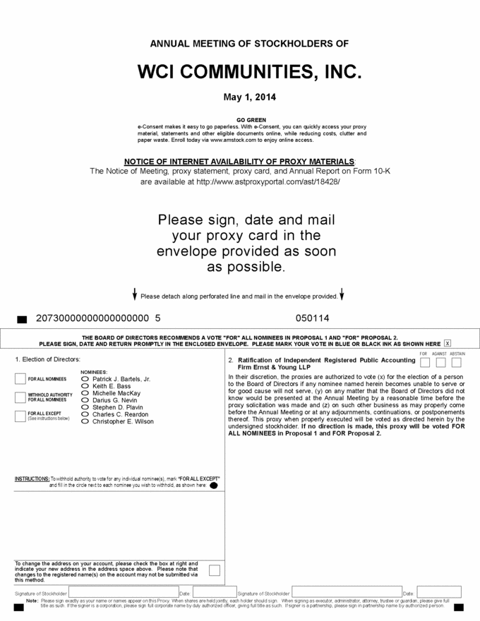 ANNUAL MEETING OF STOCKHOLDERS OF WCI COMMUNITIES, INC. May 1, 2014 GO GREEN e-Consent makes it easy to go paperless. With e-Consent, you can quickly access your proxy material, statements and other eligible documents online, while reducing costs, clutter and paper waste. Enroll today via www.amstock.com to enjoy online access. NOTICE OF INTERNET AVAILABILITY OF PROXY MATERIALS: The Notice of Meeting, proxy statement, proxy card, and Annual Report on Form 10-K are available at http://www.astproxyportal.com/ast/18428/ Please sign, date and mail your proxy card in the envelope provided as soon as possible. Please detach along perforated line and mail in the envelope provided. 20730000000000000000 5 050114 THE BOARD OF DIRECTORS RECOMMENDS A VOTE "FOR" ALL NOMINEES IN PROPOSAL 1 AND "FOR" PROPOSAL 2. PLEASE SIGN, DATE AND RETURN PROMPTLY IN THE ENCLOSED ENVELOPE. PLEASE MARK YOUR VOTE IN BLUE OR BLACK INK AS SHOWN HERE x 1. Election of Directors: NOMINEES: 2. Ratification of Independent Registered Public Accounting Firm Ernst & Young LLP FOR AGAINST ABSTAIN FOR ALL NOMINEES WITHHOLD AUTHORITY FOR ALL NOMINEES FOR ALL EXCEPT (See instructions below) Patrick J. Bartels, Jr. Keith E. Bass Michelle MacKay Darius G. Nevin Stephen D. Plavin Charles C. Reardon Christopher E. Wilson In their discretion, the proxies are authorized to vote (x) for the election of a person to the Board of Directors if any nominee named herein becomes unable to serve or for good cause will not serve, (y) on any matter that the Board of Directors did not know would be presented at the Annual Meeting by a reasonable time before the proxy solicitation was made and (z) on such other business as may properly come before the Annual Meeting or at any adjournments, continuations, or postponements thereof. This proxy when properly executed will be voted as directed herein by the undersigned stockholder. If no direction is made, this proxy will be voted FOR ALL NOMINEES in Proposal 1 and FOR Proposal 2. INSTRUCTIONS: To withhold authority to vote for any individual nominee(s), mark “FOR ALL EXCEPT” and fill in the circle next to each nominee you wish to withhold, as shown here: To change the address on your account, please check the box at right and indicate your new address in the address space above. Please note that changes to the registered name(s) on the account may not be submitted via this method. Signature of Stockholder Date: Signature of Stockholder Date: Note: Please sign exactly as your name or names appear on this Proxy. When shares are held jointly, each holder should sign. When signing as executor, administrator, attorney, trustee or guardian, please give full title as such. If the signer is a corporation, please sign full corporate name by duly authorized officer, giving full title as such. If signer is a partnership, please sign in partnership name by authorized person. |