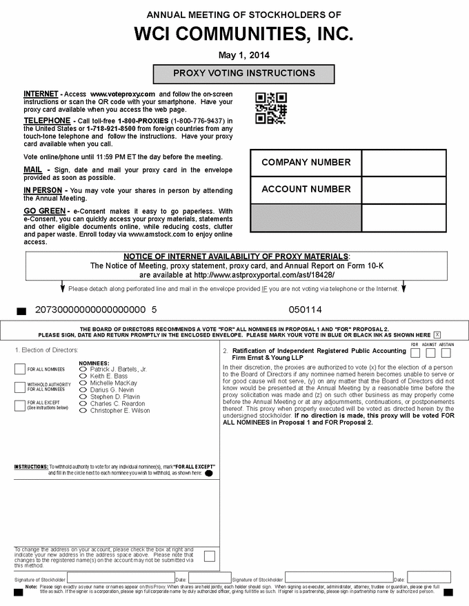 ANNUAL MEETING OF STOCKHOLDERS OF WCI COMMUNITIES, INC. May 1, 2014 PROXY VOTING INSTRUCTIONS INTERNET - Access www.voteproxy.com and follow the on-screen instructions or scan the QR code with your smartphone. Have your proxy card available when you access the web page. COMPANY NUMBER ACCOUNT NUMBER TELEPHONE - Call toll-free 1-800-PROXIES (1-800-776-9437) in the United States or 1-718-921-8500 from foreign countries from any touch-tone telephone and follow the instructions. Have your proxy card available when you call. Vote online/phone until 11:59 PM ET the day before the meeting. MAIL - Sign, date and mail your proxy card in the envelope provided as soon as possible. IN PERSON - You may vote your shares in person by attending the Annual Meeting. GO GREEN - e-Consent makes it easy to go paperless. With e-Consent, you can quickly access your proxy materials, statements and other eligible documents online, while reducing costs, clutter and paper waste. Enroll today via www.amstock.com to enjoy online access. NOTICE OF INTERNET AVAILABILITY OF PROXY MATERIALS: The Notice of Meeting, proxy statement, proxy card, and Annual Report on Form 10-K are available at http://www.astproxyportal.com/ast/18428/ Please detach along perforated line and mail in the envelope provided IF you are not voting via telephone or the Internet. 20730000000000000000 5 050114 THE BOARD OF DIRECTORS RECOMMENDS A VOTE "FOR" ALL NOMINEES IN PROPOSAL 1 AND "FOR" PROPOSAL 2. PLEASE SIGN, DATE AND RETURN PROMPTLY IN THE ENCLOSED ENVELOPE. PLEASE MARK YOUR VOTE IN BLUE OR BLACK INK AS SHOWN HERE x 1. Election of Directors: NOMINEES: 2. Ratification of Independent Registered Public Accounting Firm Ernst & Young LLP FOR AGAINST ABSTAIN FOR ALL NOMINEES WITHHOLD AUTHORITY FOR ALL NOMINEES FOR ALL EXCEPT (See instructions below) Patrick J. Bartels, Jr. Keith E. Bass Michelle MacKay Darius G. Nevin Stephen D. Plavin Charles C. Reardon Christopher E. Wilson In their discretion, the proxies are authorized to vote (x) for the election of a person to the Board of Directors if any nominee named herein becomes unable to serve or for good cause will not serve, (y) on any matter that the Board of Directors did not know would be presented at the Annual Meeting by a reasonable time before the proxy solicitation was made and (z) on such other business as may properly come before the Annual Meeting or at any adjournments, continuations, or postponements thereof. This proxy when properly executed will be voted as directed herein by the undersigned stockholder. If no direction is made, this proxy will be voted FOR ALL NOMINEES in Proposal 1 and FOR Proposal 2. INSTRUCTIONS: To withhold authority to vote for any individual nominee(s), mark “FOR ALL EXCEPT” and fill in the circle next to each nominee you wish to withhold, as shown here: To change the address on your account, please check the box at right and indicate your new address in the address space above. Please note that changes to the registered name(s) on the account may not be submitted via this method. Signature of Stockholder Date: Signature of Stockholder Date: Note: Please sign exactly as your name or names appear on this Proxy. When shares are held jointly, each holder should sign. When signing as executor, administrator, attorney, trustee or guardian, please give full title as such. If the signer is a corporation, please sign full corporate name by duly authorized officer, giving full title as such. If signer is a partnership, please sign in partnership name by authorized person. |
