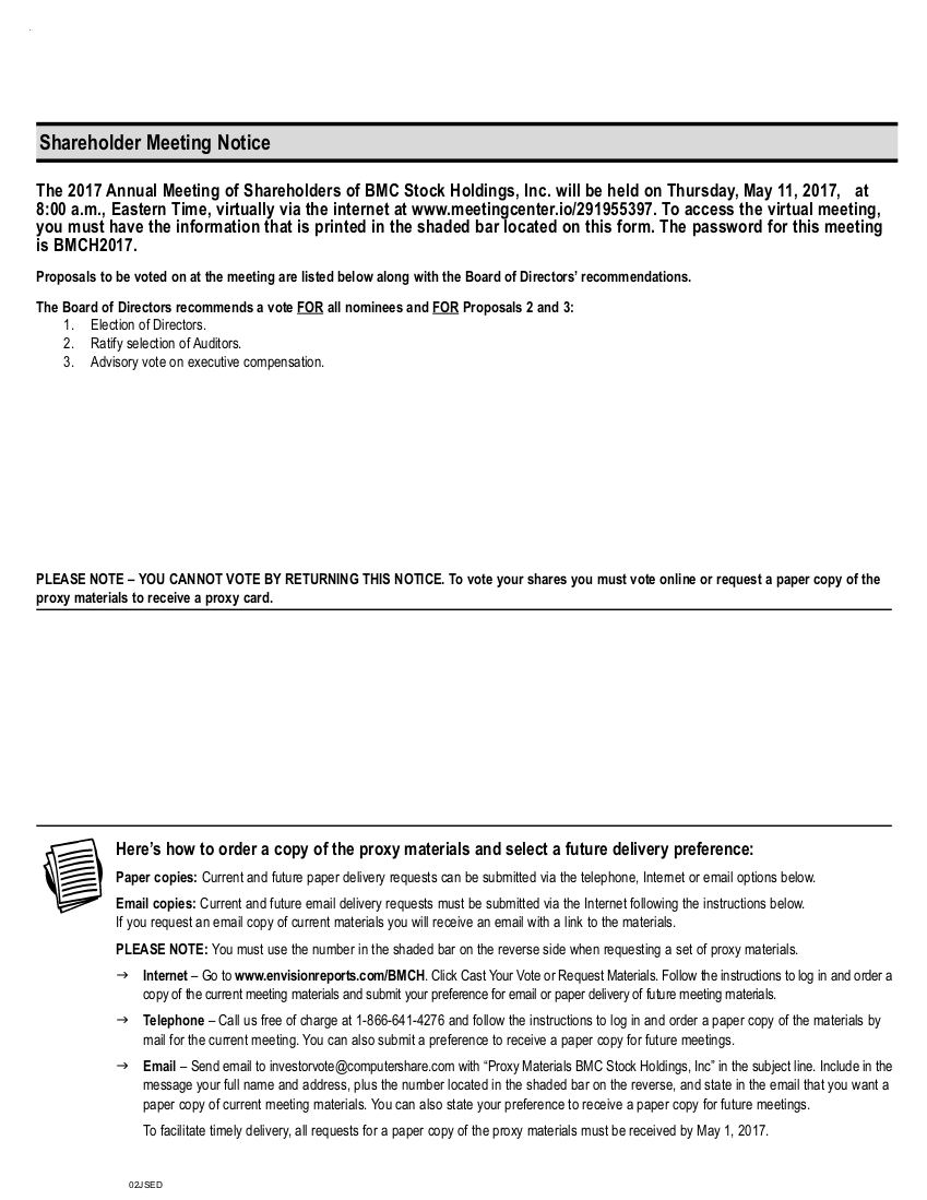 .. + BMC Stock Holdings, Inc. Important Notice Regarding the Availability of Proxy Materials for the BMC Stock Holdings, Inc. Shareholder Meeting to be Held on May 11, 2017 Under Securities and Exchange Commission rules, you are receiving this notice that the proxy materials for the annual shareholders’ meeting are available on the Internet. Follow the instructions below to view the materials and vote online or request a copy. The items to be voted on and location of the annual meeting are on the reverse side. Your vote is important! This communication presents only an overview of the more complete proxy materials that are available to you on the Internet. We encourage you to access and review all of the important information contained in the proxy materials before voting. The proxy statement and annual report to shareholders are available at: • Easy Online Access — A Convenient Way to View Proxy Materials and Vote When you go online to view materials, you can also vote your shares. Step 1: Go to www.envisionreports.com/BMCH to view the materials. Step 2: Click on Cast Your Vote or Request Materials. Step 3: Follow the instructions on the screen to log in. Step 4: Make your selection as instructed on each screen to select delivery preferences and vote. When you go online, you can also help the environment by consenting to receive electronic delivery of future materials. Obtaining a Copy of the Proxy Materials – If you want to receive a copy of these documents, you must request one. There is no charge to you for requesting a copy. Please make your request for a copy as instructed on the reverse side on or before May 1, 2017 to facilitate timely delivery. 2NOT + 02JSED
