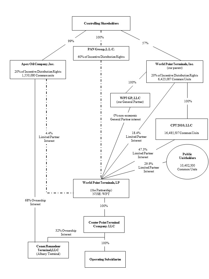 References in this annual report to (i) “World Point Terminals, LP,” the “Partnership,” “WPT,” “we,” “our,” “us” or like terms when used in a historical context refer to Center Point Terminal Company, LLC, our operating subsidiary and predecessor for accounting purposes, also referred to as “Center Point” or “our predecessor,” and when used in the present tense or prospectively, refer to World Point Terminals, LP, a Delaware limited partnership, and its subsidiaries; (ii) “our general partner” refer to WPT GP, LLC, the general partner of the Partnership; (iii) “our parent” refer to World Point Terminals, Inc. and its subsidiaries; (iv) “Apex” refer to Apex Oil Company, Inc. and its subsidiaries; (v) “the controlling unitholders” refer to several irrevocable trusts of which Paul A. Novelly, the chairman of the board of directors of our parent, our general partner and Apex, and his family are the grantors or beneficiaries, that together own the majority of the stock of our parent and Apex; (vi) “our sponsors” refer to our parent, Apex and the controlling unitholders, collectively, and (vii) “CPT 2010” refer to CPT 2010, LLC, a wholly owned subsidiary of our parent.