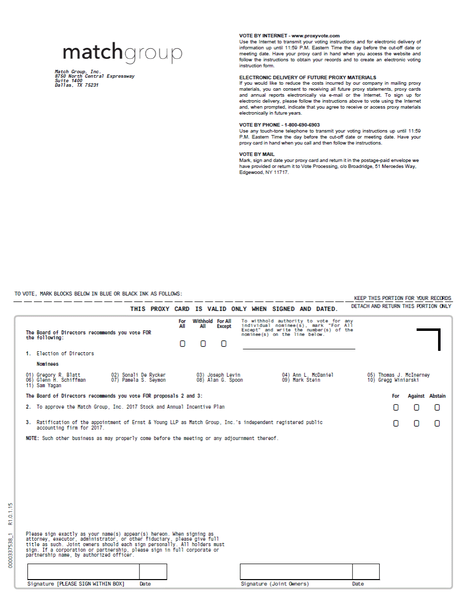 Match Group, Inc. 8750 North Central Expressway Suite 1400 Dallas, TX 75231 VOTE BY INTERNET - www.proxyvote.com Use the Internet to transmit your voting instructions and for electronic delivery of information up until 11:59 P.M. Eastern Time the day before the cut-off date or meeting date. Have your proxy card in hand when you access the website and follow the instructions to obtain your records and to create an electronic voting instruction form. ELECTRONIC DELIVERY OF FUTURE PROXY MATERIALS If you would like to reduce the costs incurred by our company in mailing proxy materials, you can consent to receiving all future proxy statements, proxy cards and annual reports electronically via e-mail or the Internet. To sign up for electronic delivery, please follow the instructions above to vote using the Internet and, when prompted, indicate that you agree to receive or access proxy materials electronically in future years. VOTE BY PHONE - 1-800-690-6903 Use any touch-tone telephone to transmit your voting instructions up until 11:59 P.M. Eastern Time the day before the cut-off date or meeting date. Have your proxy card in hand when you call and then follow the instructions. VOTE BY MAIL Mark, sign and date your proxy card and return it in the postage-paid envelope we have provided or return it to Vote Processing, c/o Broadridge, 51 Mercedes Way, Edgewood, NY 11717. TO VOTE, MARK BLOCKS BELOW IN BLUE OR BLACK INK AS FOLLOWS: THIS PROXY CARD IS VALID ONLY WHEN SIGNED AND DATED. KEEP THIS PORTION FOR YOUR RECORDS DETACH AND RETURN THIS PORTION ONLY The Board of Directors recommends you vote FOR the following: For Withhold For All AllAllExcept To withhold authority to vote for any individual nominee(s), mark “For All Except” and write the number(s) of the nominee(s) on the line below. 1. Election of Directors Nominees 000 The Board of Directors recommends you vote FOR proposals 2 and 3: ForAgainst Abstain 2. To approve the Match Group, Inc. 2017 Stock and Annual Incentive Plan 3. Ratification of the appointment of Ernst & Young LLP as Match Group, Inc.'s independent registered public accounting firm for 2017. NOTE: Such other business as may properly come before the meeting or any adjournment thereof. 0000337538_1 R1.0.1.15 000 000 Signature [PLEASE SIGN WITHIN BOX] Date Signature (Joint Owners) Date