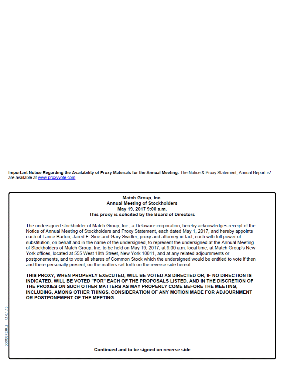 Important Notice Regarding the Availability of Proxy Materials for the Annual Meeting: The Notice & Proxy Statement, Annual Report is/ are available at www.proxyvote.com Match Group, Inc. Annual Meeting of Stockholders May 19, 2017 9:00 a.m. This proxy is solicited by the Board of Directors The undersigned stockholder of Match Group, Inc., a Delaware corporation, hereby acknowledges receipt of the Notice of Annual Meeting of Stockholders and Proxy Statement, each dated May 1, 2017, and hereby appoints each of Lance Barton, Jared F. Sine and Gary Swidler, proxy and attorney-in-fact, each with full power of substitution, on behalf and in the name of the undersigned, to represent the undersigned at the Annual Meeting of Stockholders of Match Group, Inc. to be held on May 19, 2017, at 9:00 a.m. local time, at Match Group's New York offices, located at 555 West 18th Street, New York 10011, and at any related adjournments or postponements, and to vote all shares of Common Stock which the undersigned would be entitled to vote if then and there personally present, on the matters set forth on the reverse side hereof. 0000337538_2 R1.0.1.15 Continued and to be signed on reverse side