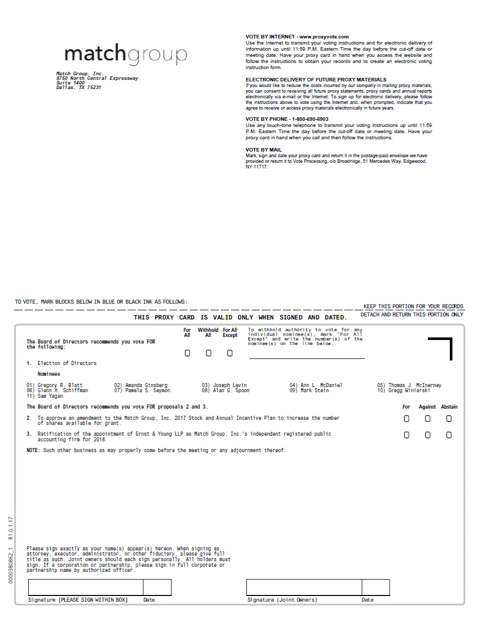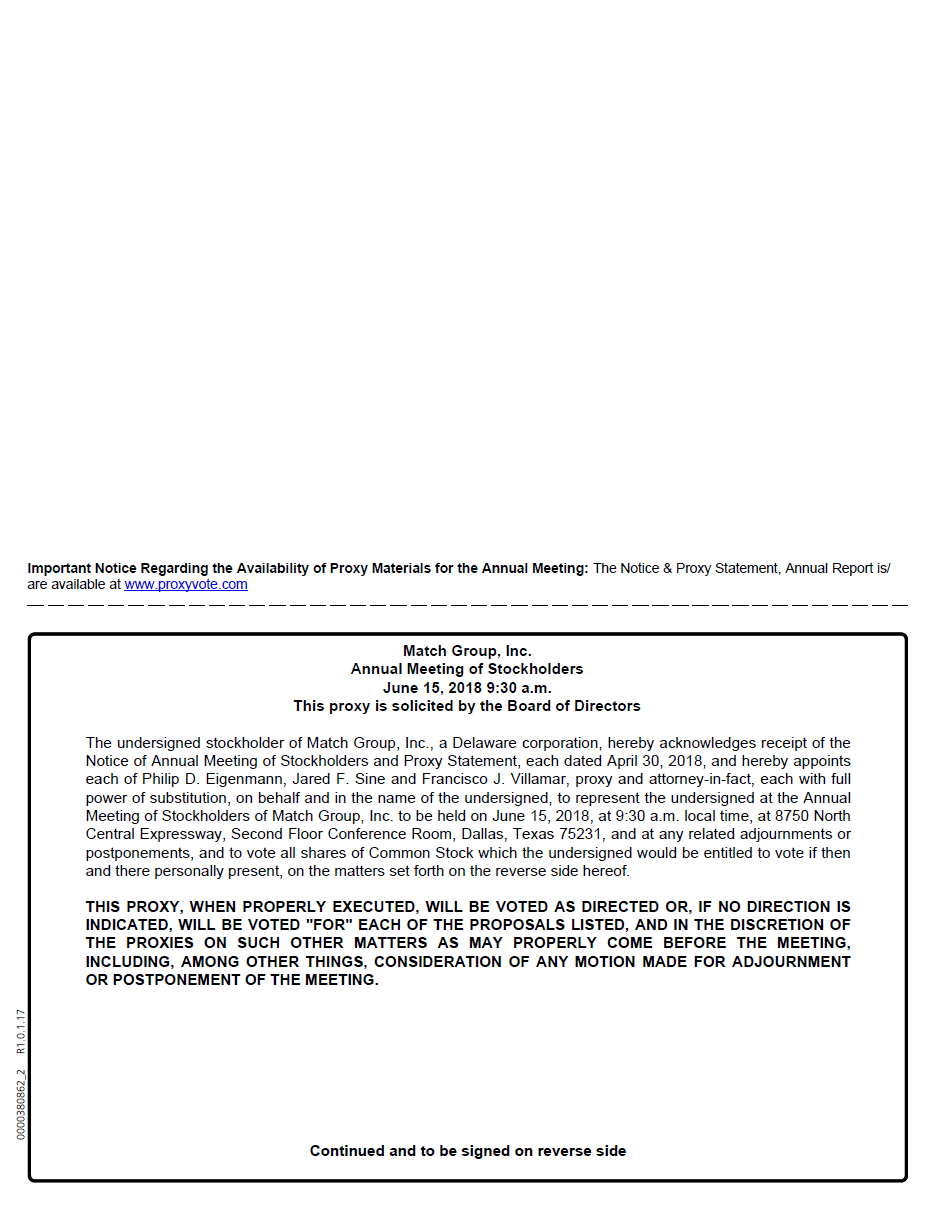 Important Notice Regarding the Availability of Proxy Materials for the Annual Meeting: The Notice & Proxy Statement, Annual Report is/ are available at www.proxyvote.com Match Group, Inc. Annual Meeting of Stockholders June 15, 2018 9:30 a.m. This proxy is solicited by the Board of Directors The undersigned stockholder of Match Group, Inc., a Delaware corporation, hereby acknowledges receipt of the Notice of Annual Meeting of Stockholders and Proxy Statement, each dated April 30, 2018, and hereby appoints each of Philip D. Eigenmann, Jared F. Sine and Francisco J. Villamar, proxy and attorney-in-fact, each with full power of substitution, on behalf and in the name of the undersigned, to represent the undersigned at the Annual Meeting of Stockholders of Match Group, Inc. to be held on June 15, 2018, at 9:30 a.m. local time, at 8750 North Central Expressway, Second Floor Conference Room, Dallas, Texas 75231, and at any related adjournments or postponements, and to vote all shares of Common Stock which the undersigned would be entitled to vote if then and there personally present, on the matters set forth on the reverse side hereof. THIS PROXY, WHEN PROPERLY EXECUTED, WILL BE VOTED AS DIRECTED OR, IF NO DIRECTION IS INDICATED, WILL BE VOTED "FOR" EACH OF THE PROPOSALS LISTED, AND IN THE DISCRETION OF THE PROXIES ON SUCH OTHER MATTERS AS MAY PROPERLY COME BEFORE THE MEETING, INCLUDING, AMONG OTHER THINGS, CONSIDERATION OF ANY MOTION MADE FOR ADJOURNMENT OR POSTPONEMENT OF THE MEETING. Continued and to be signed on reverse side 0000380862_2 R1.0.1.17