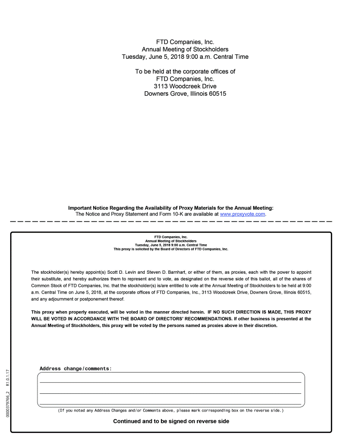 FTD Companies, Inc. Annual Meeting of Stockholders Tuesday, June 5, 2018 9:00 a.m. Central Time To be held at the corporate offices of FTD Companies, Inc. 3113 Woodcreek Drive Downers Grove, Illinois 60515 Important Notice Regarding the Availability of Proxy Materials for the Annual Meeting: The Notice and Proxy Statement and Form 10-K are available at www.proxyvote.com. FTD Companies, Inc. Annual Meeting of Stockholders Tuesday, June 5, 2018 9:00 a.m. Central Time This proxy is solicited by the Board of Directors of FTD Companies, Inc. The stockholder(s) hereby appoint(s) Scott D. Levin and Steven D. Barnhart, or either of them, as proxies, each with the power to appoint their substitute, and hereby authorizes them to represent and to vote, as designated on the reverse side of this ballot, all of the shares of Common Stock of FTD Companies, Inc. that the stockholder(s) is/are entitled to vote at the Annual Meeting of Stockholders to be held at 9:00 a.m. Central Time on June 5, 2018, at the corporate offices of FTD Companies, Inc., 3113 Woodcreek Drive, Downers Grove, Illinois 60515, and any adjournment or postponement thereof. This proxy when properly executed, will be voted in the manner directed herein. IF NO SUCH DIRECTION IS MADE, THIS PROXY WILL BE VOTED IN ACCORDANCE WITH THE BOARD OF DIRECTORS' RECOMMENDATIONS. If other business is presented at the Annual Meeting of Stockholders, this proxy will be voted by the persons named as proxies above in their discretion. Address change/comments: (If you noted any Address Changes and/or Comments above, please mark corresponding box on the reverse side.) Continued and to be signed on reverse side 0000379766_2 R1.0.1.17