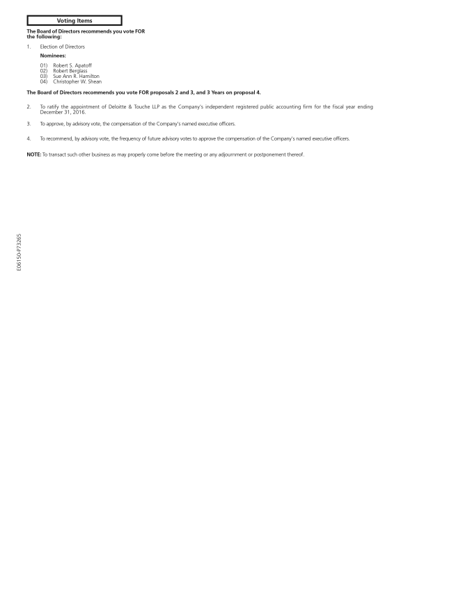 The Board of Directors recommends you vote FOR the following: 1. Election of Directors Nominees: 01) Robert S. Apatoff 02) Robert Berglass 03) Sue Ann R. Hamilton 04) Christopher W. Shean The Board of Directors recommends you vote FOR proposals 2 and 3, and 3 Years on proposal 4. 2. To ratify the appointment of Deloitte & Touche LLP as the Company's independent registered public accounting firm for the fiscal year ending December 31, 2016. 3. To approve, by advisory vote, the compensation of the Company's named executive officers. 4. To recommend, by advisory vote, the frequency of future advisory votes to approve the compensation of the Company's named executive officers. NOTE: To transact such other business as may properly come before the meeting or any adjournment or postponement thereof. E06150-P73265 Voting Items