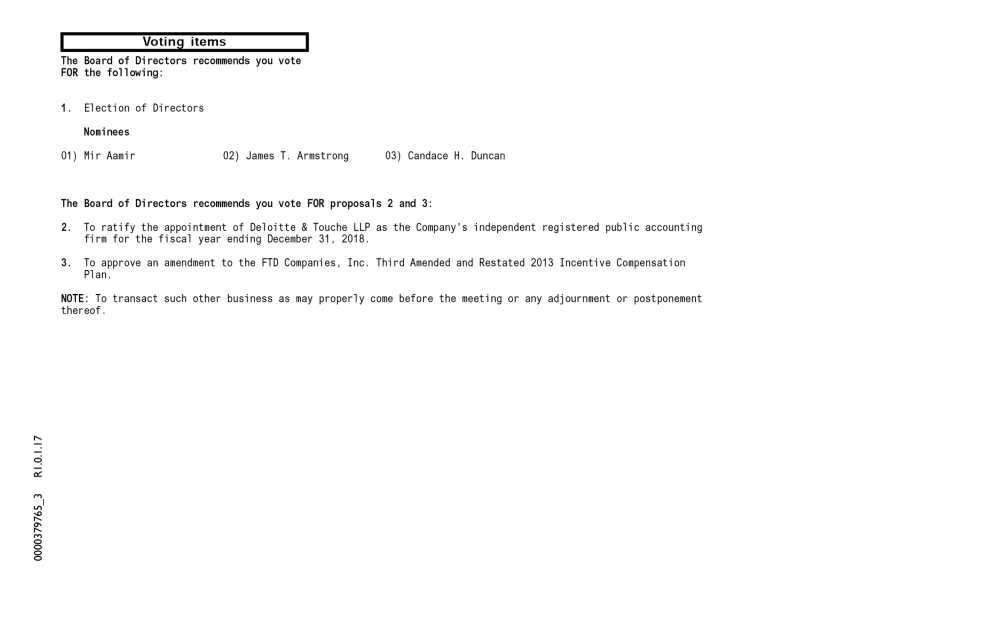 The Board of Directors recommends you vote FOR the following: 1. Election of Directors Nominees 01) Mir Aamir 02) James T. Armstrong 03) Candace H. Duncan The Board of Directors recommends you vote FOR proposals 2 and 3: 2. To ratify the appointment of Deloitte & Touche LLP as the Company's independent registered public accounting firm for the fiscal year ending December 31, 2018. 3. To approve an amendment to the FTD Companies, Inc. Third Amended and Restated 2013 Incentive Compensation Plan. NOTE: To transact such other business as may properly come before the meeting or any adjournment or postponement thereof. 0000379765_3 R1.0.1.17 Voting items