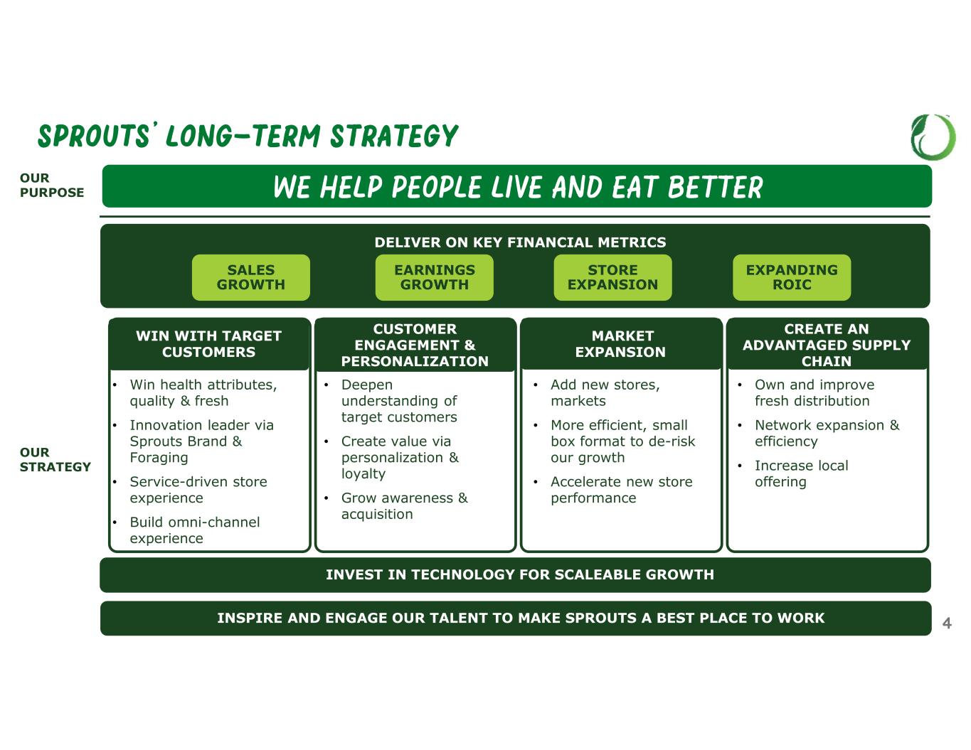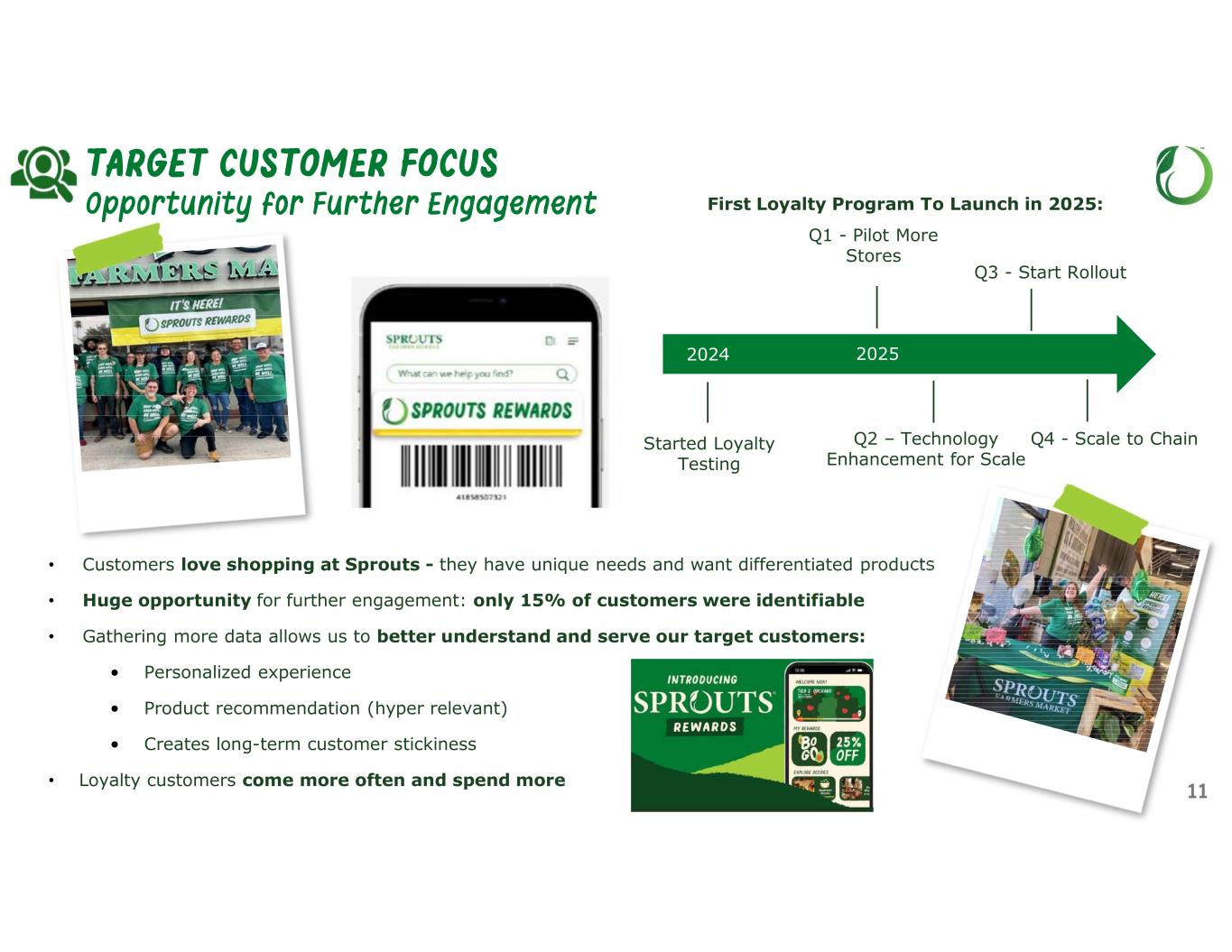 SPROUTS’ STRATEGY MILESTONES 2024202320222020/2021 Customer Store Format Supply Chain Team Financials • E-commerce Boom • Change in Promotional Strategy • Positive Traffic • Sprouts Brand reaches > $1B sales • Foraging Team • Ecommerce – added Doordash • Innovation Center • Ecommerce reaches >$1B in sales; added UberEats • Loyalty program test • Created smaller go-forward 23K sq ft store format • Revamp RE site selection process • 16 new stores • Implement small store format stores • 30 new stores – high single-digit growth • 33 new stores • Added new state of Wyoming • Scott Neal - Chief Merchant • Nick Konat - President, COO • Alisa Gmelich - Chief Marketing • Jim Bahrenburg - CTO • Curtis Valentine - CFO • Dustin Hamilton - Chief Stores Officer • New DCs: Florida & Colorado • Implemented inventory management process & systems • Improved shrink by leveraging new systems • GM improved by 300 bps over 2019 due to promotional strategy changes • Double-digit EPS growth • Comp acceleration begins as strategy takes hold • Comps over 3% • Double-digit EPS growth • GM improved 330 bps over 2019 • Comps 7.6% • Zero debt on revolver • Revenue growth 13% • EPS growth 32% • EBIT margin +260 bps over 2019 • New Southern CA DC and expand TX DC 28