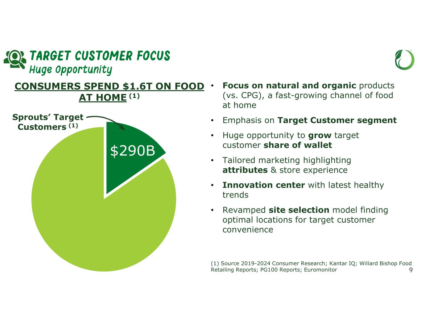 >20% Vegan >30% non-GMO >45% organic >55% gluten-free >35% organic ~30% vegan >60% Non-GMO >50% organic >25% plant-based 100% cage-free or better eggs >45% gluten-free >40% Non-GMO >20% vegan ~ 25% organic >70% gluten-free >50% Non-GMO >40% vegan ~20% gluten-free >10% non-GMO ~25% organic >20% Kosher ~20% organic >15% non-GMO >50% of Beef sales are grass-fed 100% responsibly-sourced seafood 8 DIFFERENTIATED ASSORTMENT More than 70% of Products Sold are Attribute-Driven