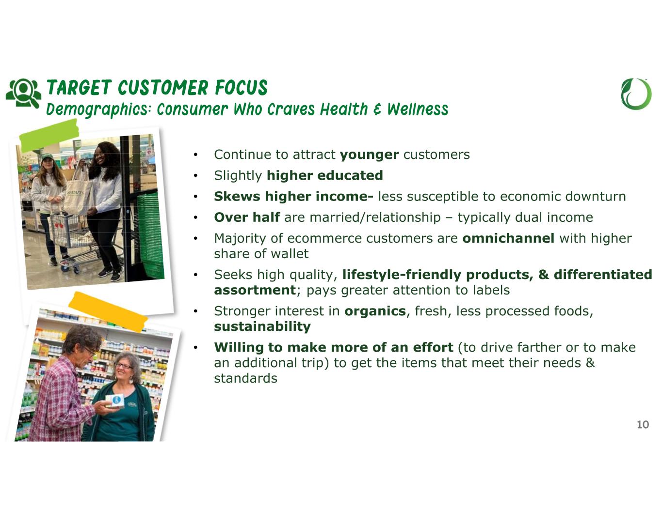 9 • Focus on natural and organic products (vs. CPG), a fast-growing channel of food at home • Emphasis on Target Customer segment • Huge opportunity to grow target customer share of wallet • Tailored marketing highlighting attributes & store experience • Innovation center with latest healthy trends • Revamped site selection model finding optimal locations for target customer convenience CONSUMERS SPEND $1.6T ON FOOD AT HOME (1) Sprouts’ Target Customers (1) (1) Source 2019-2024 Consumer Research; Kantar IQ; Willard Bishop Food Retailing Reports; PG100 Reports; Euromonitor $290B TARGET CUSTOMER FOCUS Huge Opportunity