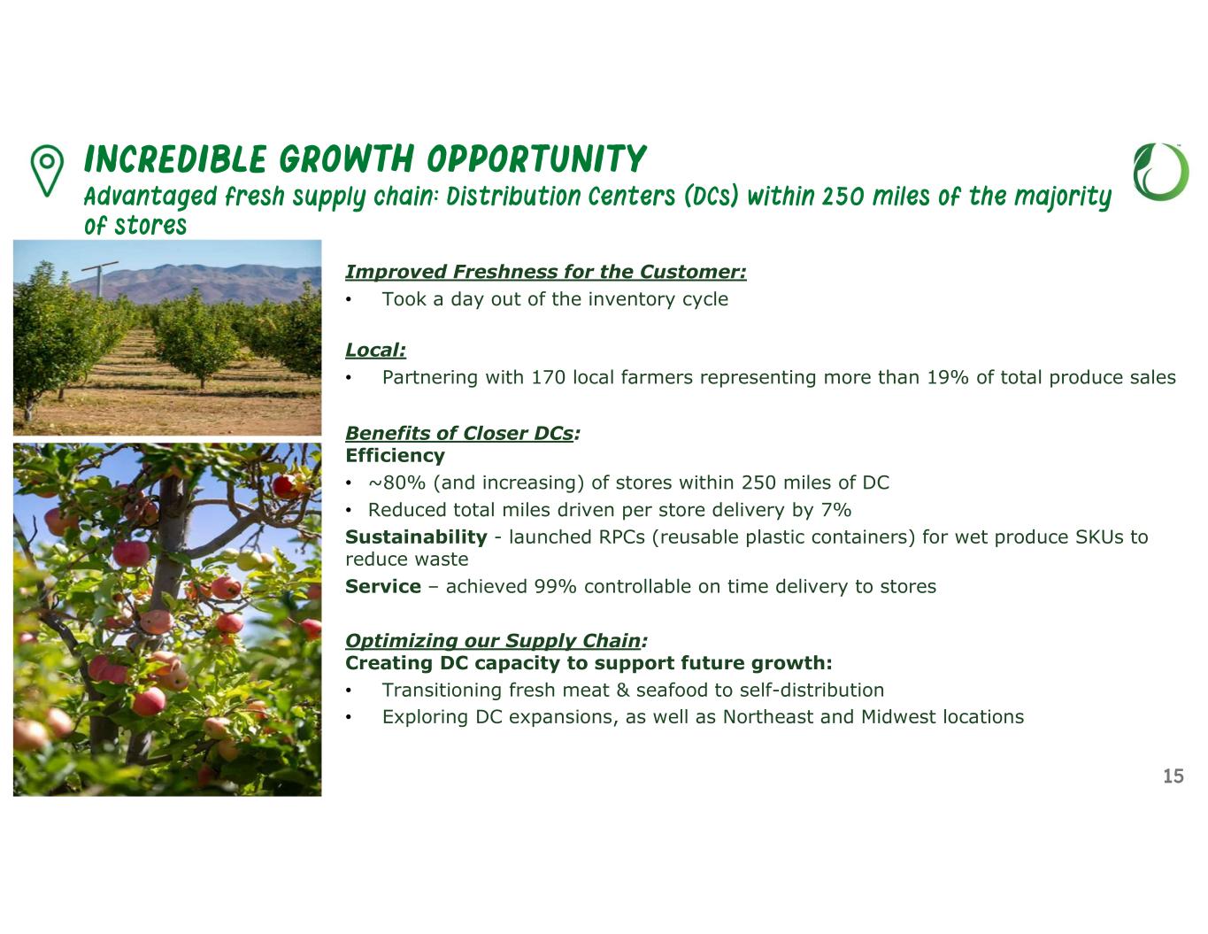 Improved Freshness for the Customer: • Took a day out of the inventory cycle Local: • Partnering with 170 local farmers representing more than 19% of total produce sales Benefits of Closer DCs: Efficiency • ~80% (and increasing) of stores within 250 miles of DC • Reduced total miles driven per store delivery by 7% Sustainability - launched RPCs (reusable plastic containers) for wet produce SKUs to reduce waste Service – achieved 99% controllable on time delivery to stores Optimizing our Supply Chain: Creating DC capacity to support future growth: • Transitioning fresh meat & seafood to self-distribution • Exploring DC expansions, as well as Northeast and Midwest locations 15 INCREDIBLE GROWTH OPPORTUNITY Advantaged fresh supply chain: Distribution Centers (DCs) within 250 miles of the majority of stores