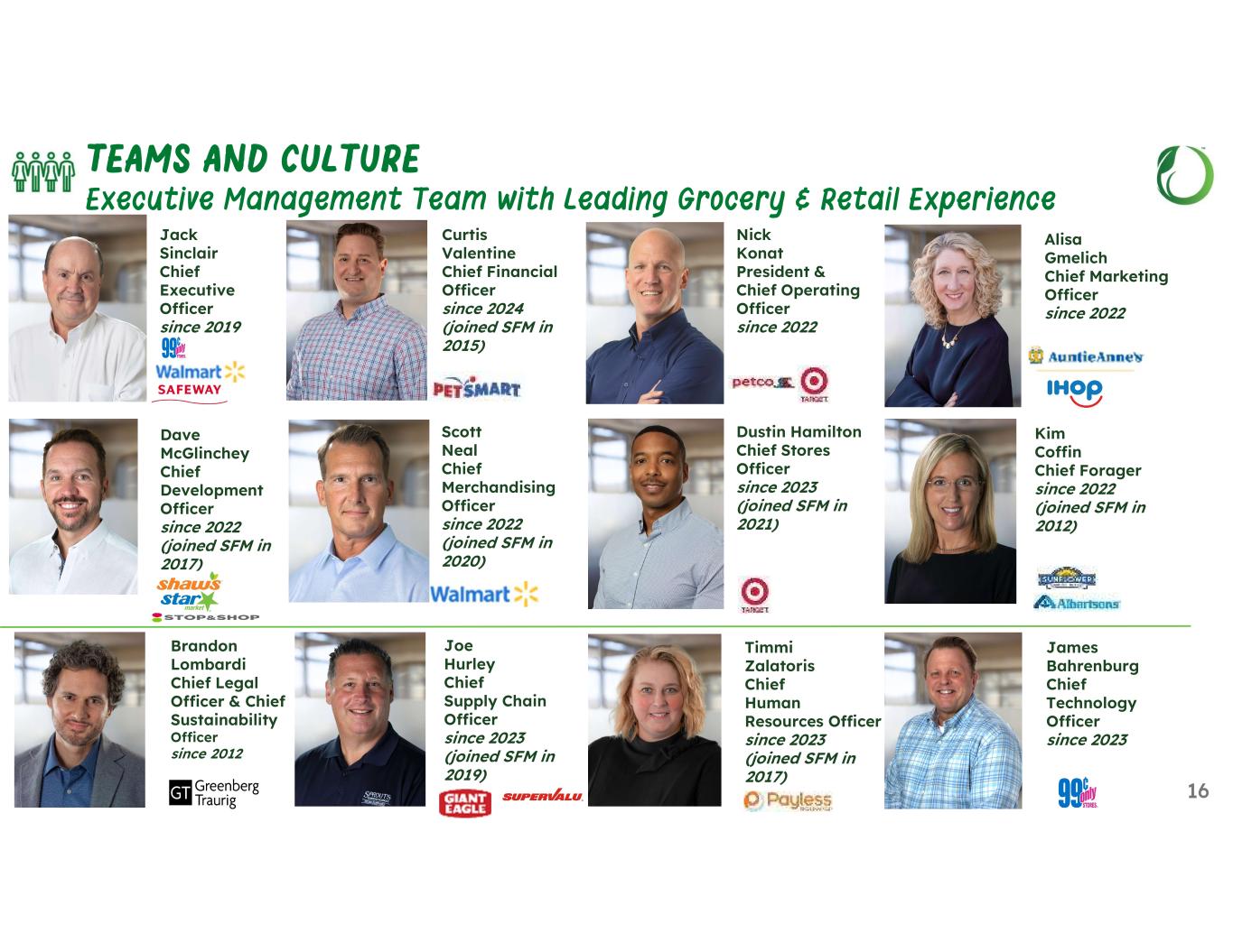 16 TEAMS AND CULTURE Executive Management Team with Leading Grocery & Retail Experience Jack Sinclair Chief Executive Officer since 2019 Curtis Valentine Chief Financial Officer since 2024 (joined SFM in 2015) Scott Neal Chief Merchandising Officer since 2022 (joined SFM in 2020) Dustin Hamilton Chief Stores Officer since 2023 (joined SFM in 2021) Dave McGlinchey Chief Development Officer since 2022 (joined SFM in 2017) Brandon Lombardi Chief Legal Officer & Chief Sustainability Officer since 2012 Kim Coffin Chief Forager since 2022 (joined SFM in 2012) Joe Hurley Chief Supply Chain Officer since 2023 (joined SFM in 2019) James Bahrenburg Chief Technology Officer since 2023 Timmi Zalatoris Chief Human Resources Officer since 2023 (joined SFM in 2017) Nick Konat President & Chief Operating Officer since 2022 Alisa Gmelich Chief Marketing Officer since 2022