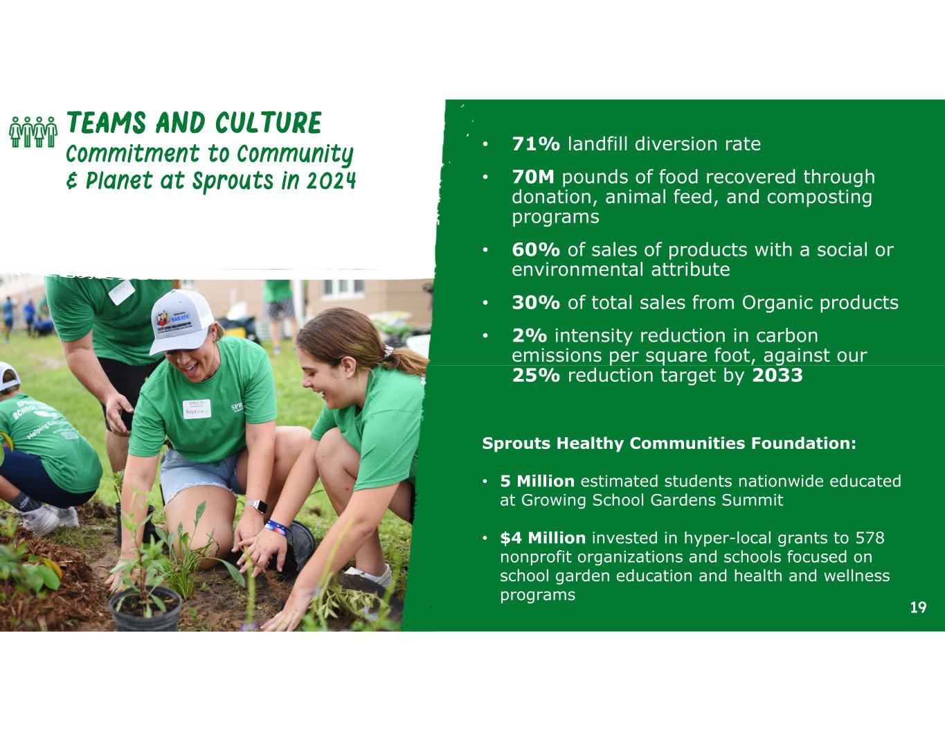 • 71% landfill diversion rate • 70M pounds of food recovered through donation, animal feed, and composting programs • 60% of sales of products with a social or environmental attribute • 30% of total sales from Organic products • 2% intensity reduction in carbon emissions per square foot, against our 25% reduction target by 2033 Sprouts Healthy Communities Foundation: • 5 Million estimated students nationwide educated at Growing School Gardens Summit • $4 Million invested in hyper-local grants to 578 nonprofit organizations and schools focused on school garden education and health and wellness programs 19 TEAMS AND CULTURE Commitment to Community & Planet at Sprouts in 2024