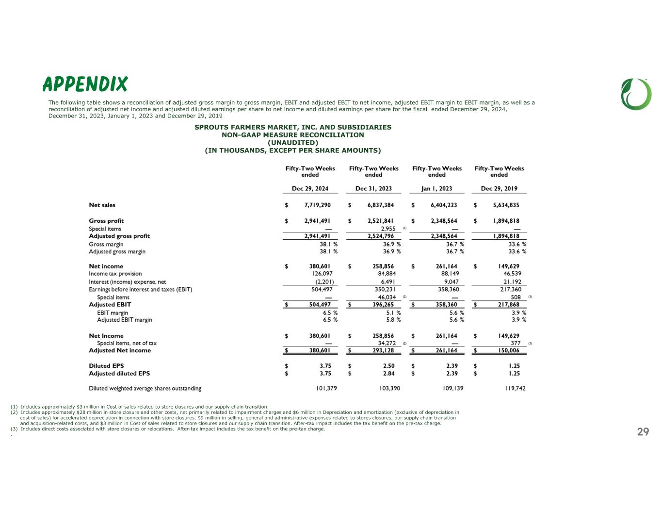 APPENDIX SPROUTS FARMERS MARKET, INC. AND SUBSIDIARIES NON-GAAP MEASURE RECONCILIATION (UNAUDITED) (IN THOUSANDS, EXCEPT PER SHARE AMOUNTS) The following table shows a reconciliation of adjusted gross margin to gross margin, EBIT and adjusted EBIT to net income, adjusted EBIT margin to EBIT margin, as well as a reconciliation of adjusted net income and adjusted diluted earnings per share to net income and diluted earnings per share for the fiscal ended December 29, 2024, December 31, 2023, January 1, 2023 and December 29, 2019 (1) Includes approximately $3 million in Cost of sales related to store closures and our supply chain transition. (2) Includes approximately $28 million in store closure and other costs, net primarily related to impairment charges and $6 million in Depreciation and amortization (exclusive of depreciation in cost of sales) for accelerated depreciation in connection with store closures, $9 million in selling, general and administrative expenses related to stores closures, our supply chain transition and acquisition-related costs, and $3 million in Cost of sales related to store closures and our supply chain transition. After-tax impact includes the tax benefit on the pre-tax charge. (3) Includes direct costs associated with store closures or relocations. After-tax impact includes the tax benefit on the pre-tax charge. . 29