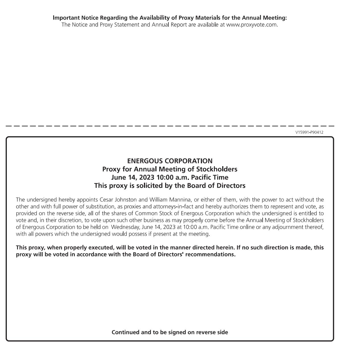 us SCAN TO VIEW MATERIALS & VOTE ENERGOUS CORPORATION 3590 NORTH FIRST STREET, SUITE 210 SAN JOSE, CA 95134 VOTE BY INTERNET Before The Meeting - Go to www.proxyvote.com or scan the QR Barcode above Use the Internet to transmit your voting instructions and for electronic delivery of information up until 8:59 p.m. Pacific Time the day before the meeting date. Have your proxy card in hand when you access the web site and follow the instructions to obtain your records and to create an electronic voting instruction form. During The Meeting - Go to www.virtualshareholdermeeting.com/WATT2022 You may attend the meeting via the Internet and vote during the meeting. Have the information that is printed in the box marked by the arrow available and follow the instructions. VOTE BY PHONE - 1-800-690-6903 Use any touch-tone telephone to transmit your voting instructions up until 8:59 p.m. Pacific Time the day before the meeting date. Have your proxy card in hand when you call and then follow the instructions. VOTE BY MAIL Mark, sign and date your proxy card and return it in the postage-paid envelope we have provided or return it to Vote Processing, c/o Broadridge, 51 Mercedes Way, Edgewood, NY 11717. TO VOTE, MARK BLOCKS BELOW IN BLUE OR BLACK INK AS FOLLOWS: D85724-P73484 KEEP THIS PORTION FOR YOUR RECORDS THIS PROXY CARD IS VALID ONLY WHEN SIGNED AND DATED. ENERGOUS CORPORATION 3590 NORTH FIRST STREET, SUITE 210 SAN JOSE, CA 95134 ENERGOUS CORPORATION To withhold authority to vote for any individual nominee(s), mark "For All Except" and write the number(s) of the nominee(s) on the line below. The Board of Directors recommends you vote FOR ALL of the following 1. Election of Directors Nominees: 01) Kathleen Bayless 02) Sheryl Wilkerson 03) Rahul Patel 04) Reynette Au For All Withhold All For All Except The Board of Directors recommends you vote FOR proposal 2. 2. To ratify the appointment of Marcum LLP as our independent registered public accounting firm for 2022. NOTE: To transact such other business as may properly come before the annual meeting and any adjournments or postponements thereof. Abstain Against For Please sign exactly as your name(s) appear(s) hereon. When signing as attorney, executor, administrator, or other fiduciary, please give full title as such. Joint owners should each sign personally. All holders must sign. If a corporation or partnership, please sign in full corporate or partnership name by authorized officer. Signature [PLEASE SIGN WITHIN BOX] Date Signature (Joint Owners) Date
