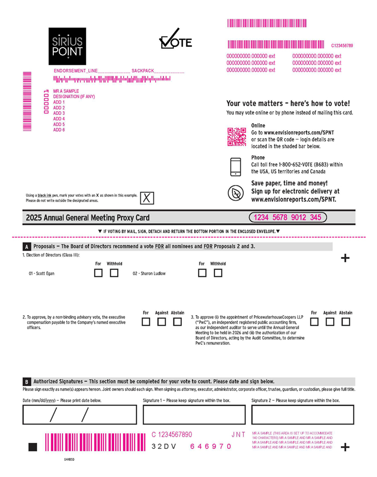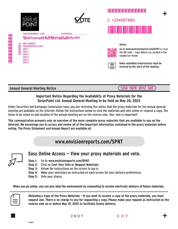 On behalf of the Board of Directors, it is my pleasure to invite you to attend the 2025 Annual General Meeting (the “Annual General Meeting”) of SiriusPoint Ltd. The meeting will be held in a virtual format on Tuesday, May 20, 2025, beginning at 10:00 a.m. (Atlantic Daylight Time). The meeting will be conducted via a live audio webcast at https://meetnow.global/MPKXMPR, where you will be able to vote electronically and submit questions during the meeting.