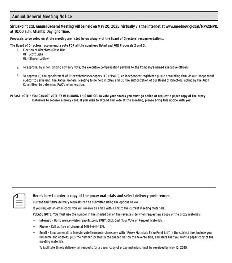 | NOTICE OF 2025 ANNUAL GENERAL MEETING OF SHAREHOLDERS OF SIRIUSPOINT LTD. |