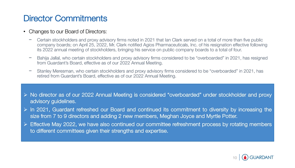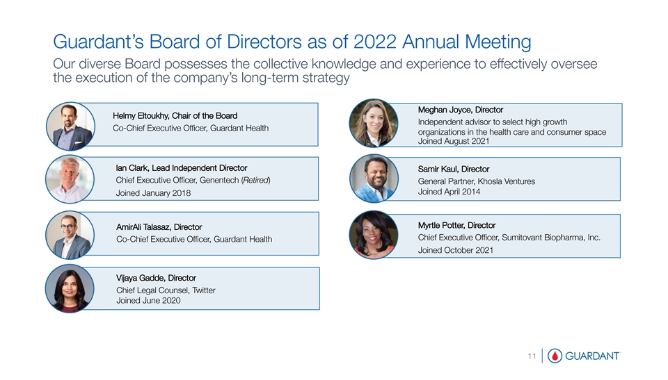 Director Commitments • Changes to our Board of Directors: ꟷ Certain stockholders and proxy advisory firms noted in 2021 that Ian Clark served on a total of more than five public company boards; on April 25, 2022, Mr. Clark notified Agios Pharmaceuticals, Inc. of his resignation effective following its 2022 annual meeting of stockholders, bringing his service on public company boards to a total of four. ꟷ Bahija Jallal, who certain stockholders and proxy advisory firms considered to be “overboarded” in 2021, has resigned from Guardant’s Board, effective as of our 2022 Annual Meeting. ꟷ Stanley Meresman, who certain stockholders and proxy advisory firms considered to be “overboarded” in 2021, has retired from Guardant’s Board, effective as of our 2022 Annual Meeting. Ø No director as of our 2022 Annual Meeting is considered “overboarded” under stockholder and proxy advisory guidelines. Ø In 2021, Guardant refreshed our Board and continued its commitment to diversity by increasing the size from 7 to 9 directors and adding 2 new members, Meghan Joyce and Myrtle Potter. Ø Effective May 2022, we have also continued our committee refreshment process by rotating members to different committees given their strengths and expertise. 10