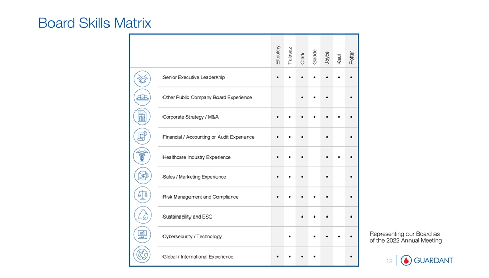 Guardant’s Board of Directors as of 2022 Annual Meeting Our diverse Board possesses the collective knowledge and experience to effectively oversee the execution of the company’s long-term strategy Meghan Joyce, Director Helmy Eltoukhy, Chair of the Board Independent advisor to select high growth Co-Chief Executive Officer, Guardant Health organizations in the health care and consumer space Joined August 2021 Ian Clark, Lead Independent Director Samir Kaul, Director Chief Executive Officer, Genentech (Retired) General Partner, Khosla Ventures Joined April 2014 Joined January 2018 Myrtle Potter, Director AmirAli Talasaz, Director Chief Executive Officer, Sumitovant Biopharma, Inc. Co-Chief Executive Officer, Guardant Health Joined October 2021 Vijaya Gadde, Director Chief Legal Counsel, Twitter Joined June 2020 11