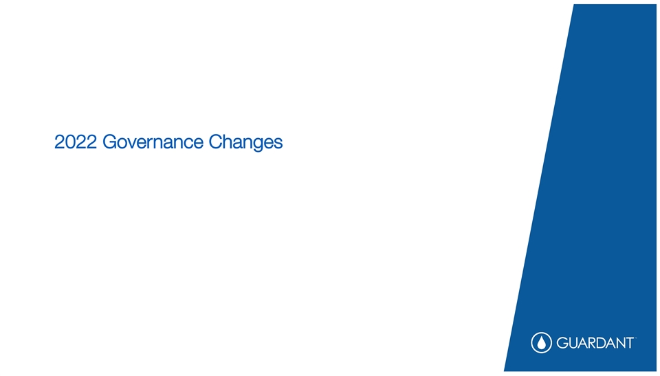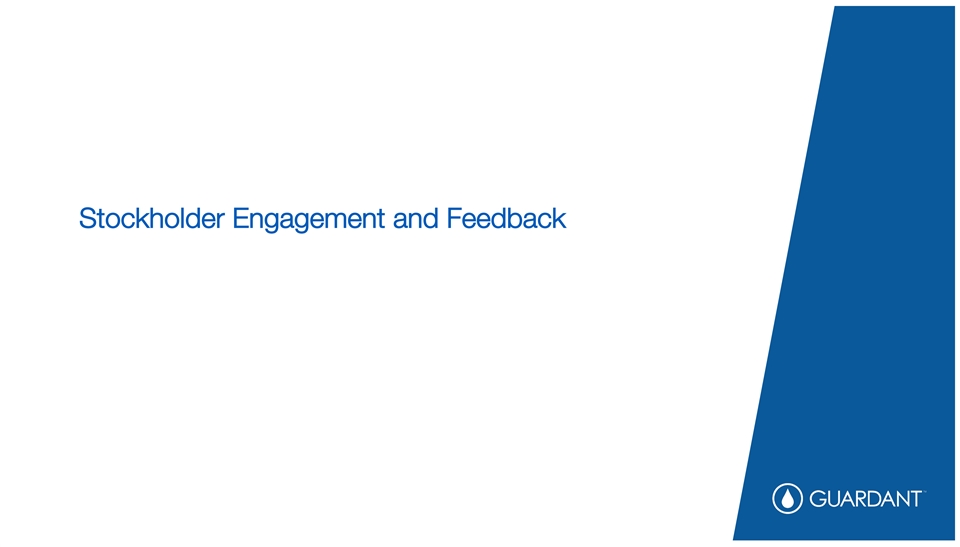 Stockholder Feedback – Environmental, Social & Governance (ESG) Feedback : Stockholders wanted to understand and see more disclosure regarding Guardant’s ESG strategy • At our Board’s request, we conducted a detailed company-wide analysis regarding its current practices around diversity and inclusion initiatives, workplace diversity, pay and race we significantly expanded our public equity and environmental sustainability. As a result, disclosure of ESG in both our Form 10-K and proxy statement. • We have also established formal Board-level oversight responsibility for ESG. Our Governance Committee updated its charter to reflect this responsibility, with the Compensation Committee responsible for oversight of human capital issues. • We are engaging an ESG consultant to assist us in developing our formal ESG strategic plan and programming. The Board has asked management to report back on Guardant’s progress before publication of its 2022 Annual Report on Form 10-K (which will be filed in 2023). We expect to release our first ESG annual report in the first half of 2023. 19
