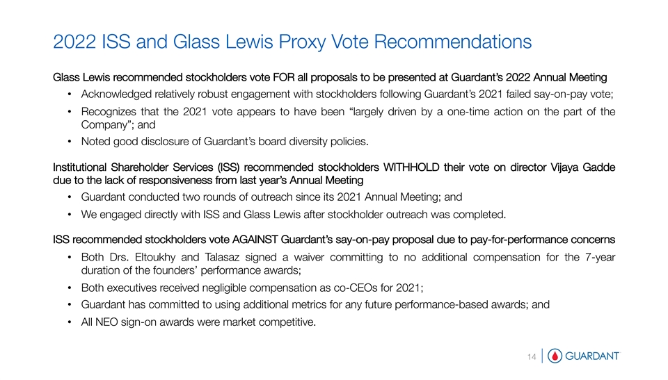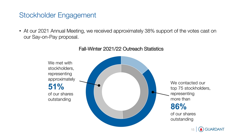 2022 ISS and Glass Lewis Proxy Vote Recommendations Glass Lewis recommended stockholders vote FOR all proposals to be presented at Guardant’s 2022 Annual Meeting • Acknowledged relatively robust engagement with stockholders following Guardant’s 2021 failed say-on-pay vote; • Recognizes that the 2021 vote appears to have been “largely driven by a one-time action on the part of the Company”; and • Noted good disclosure of Guardant’s board diversity policies. Institutional Shareholder Services (ISS) recommended stockholders WITHHOLD their vote on director Vijaya Gadde due to the lack of responsiveness from last year’s Annual Meeting • Guardant conducted two rounds of outreach since its 2021 Annual Meeting; and • We engaged directly with ISS and Glass Lewis after stockholder outreach was completed. ISS recommended stockholders vote AGAINST Guardant’s say-on-pay proposal due to pay-for-performance concerns • Both Drs. Eltoukhy and Talasaz signed a waiver committing to no additional compensation for the 7-year duration of the founders’ performance awards; • Both executives received negligible compensation as co-CEOs for 2021; • Guardant has committed to using additional metrics for any future performance-based awards; and • All NEO sign-on awards were market competitive. 14