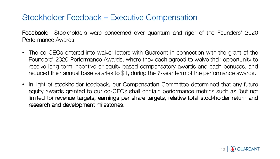 Stockholder Feedback – Executive Compensation Feedback: Stockholders were concerned over quantum and rigor of the Founders’ 2020 Performance Awards • The co-CEOs entered into waiver letters with Guardant in connection with the grant of the Founders’ 2020 Performance Awards, where they each agreed to waive their opportunity to receive long-term incentive or equity-based compensatory awards and cash bonuses, and reduced their annual base salaries to $1, during the 7-year term of the performance awards. • In light of stockholder feedback, our Compensation Committee determined that any future equity awards granted to our co-CEOs shall contain performance metrics such as (but not revenue targets, earnings per share targets, relative total stockholder return and limited to) research and development milestones . 16