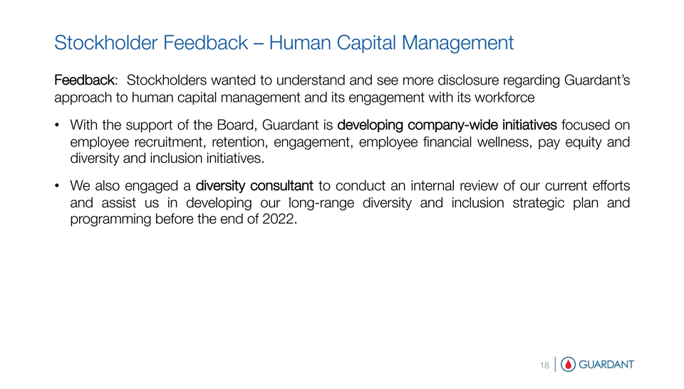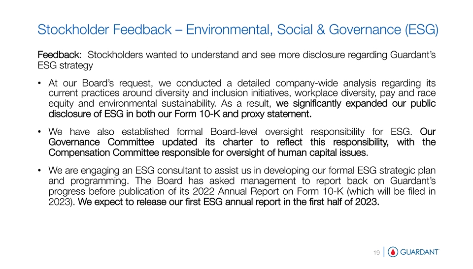 Stockholder Feedback – Human Capital Management Feedback: Stockholders wanted to understand and see more disclosure regarding Guardant’s approach to human capital management and its engagement with its workforce • With the support of the Board, Guardant is developing company-wide initiatives focused on employee recruitment, retention, engagement, employee financial wellness, pay equity and diversity and inclusion initiatives. • We also engaged a diversity consultant to conduct an internal review of our current efforts and assist us in developing our long-range diversity and inclusion strategic plan and programming before the end of 2022. 18