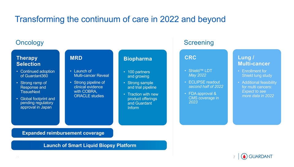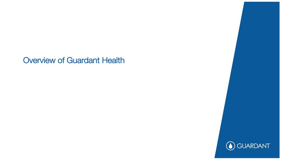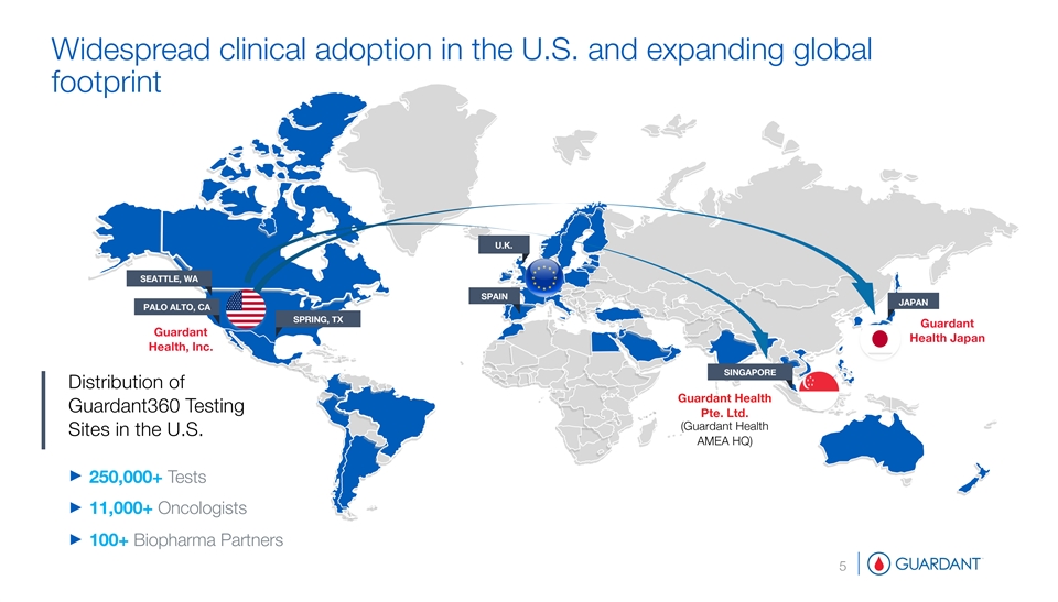 Widespread clinical adoption in the U.S. and expanding global footprint U.K. SEATTLE, WA SPAIN JAPAN PALO ALTO, CA SPRING, TX Guardant Guardant Health Japan Health, Inc. SINGAPORE Distribution of Guardant Health Guardant360 Testing Pte. Ltd. (Guardant Health Sites in the U.S. AMEA HQ) 250,000+ Tests 11,000+ Oncologists 100+ Biopharma Partners 5