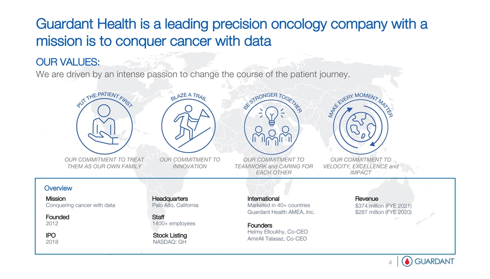 Guardant Health is a leading precision oncology company with a mission is to conquer cancer with data OUR VALUES: We are driven by an intense passion to change the course of the patient journey. OUR COMMITMENT TO TREAT OUR COMMITMENT TO OUR COMMITMENT TO OUR COMMITMENT TO THEM AS OUR OWN FAMILY INNOVATION TEAMWORK and CARING FOR VELOCITY, EXCELLENCE and EACH OTHER IMPACT Overview Mission Headquarters International Revenue Conquering cancer with data Palo Alto, California Marketed in 40+ countries $374 million (FYE 2021) Guardant Health AMEA, Inc. $287 million (FYE 2020) Founded Staff 2012 1400+ employees Founders Helmy Eltoukhy, Co-CEO IPO Stock Listing AmirAli Talasaz, Co-CEO 2018 NASDAQ: GH 4