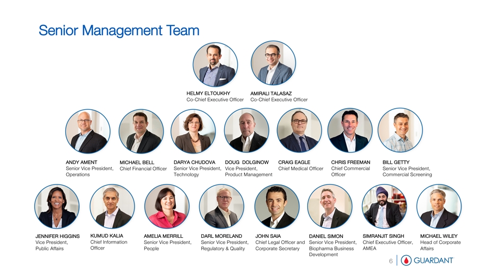 Senior Management Team HELMY ELTOUKHY AMIRALI TALASAZ Co-Chief Executive Officer Co-Chief Executive Officer ANDY AMENT MICHAEL BELL DARYA CHUDOVA DOUG DOLGINOW CRAIG EAGLE CHRIS FREEMAN BILL GETTY Senior Vice President, Chief Financial Officer Senior Vice President, Vice President, Chief Medical Officer Chief Commercial Senior Vice President, Operations Technology Product Management Officer Commercial Screening KUMUD KALIA JENNIFER HIGGINS AMELIA MERRILL DARL MORELAND JOHN SAIA DANIEL SIMON SIMRANJIT SINGH MICHAEL WILEY Vice President, Chief Information Senior Vice President, Senior Vice President, Chief Legal Officer and Senior Vice President, Chief Executive Officer, Head of Corporate Public Affairs Officer People Regulatory & Quality Corporate Secretary Biopharma Business AMEA Affairs Development 6 6