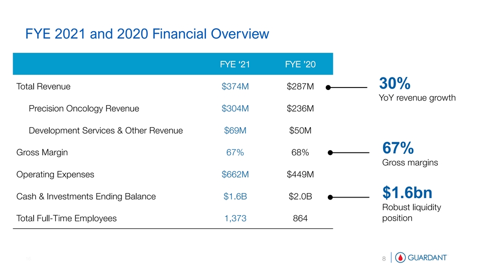 Transforming the continuum of care in 2022 and beyond Oncology Screening CRC Lung / Therapy MRD Biopharma Multi-cancer Selection • Shield™ LDT • Launch of • Enrollment for • Continued adoption • 100 partners May 2022 Multi-cancer Reveal Shield lung study of Guardant360 and growing • ECLIPSE readout • Strong pipeline of • Additional feasibility • Strong ramp of • Strong sample second half of 2022 clinical evidence for multi cancers: Response and and trial pipeline with COBRA, Expect to see TissueNext • FDA approval & • Traction with new ORACLE studies more data in 2022 CMS coverage in • Global footprint and product offerings 2023 pending regulatory and Guardant approval in Japan Inform Expanded reimbursement coverage Launch of Smart Liquid Biopsy Platform 29 7