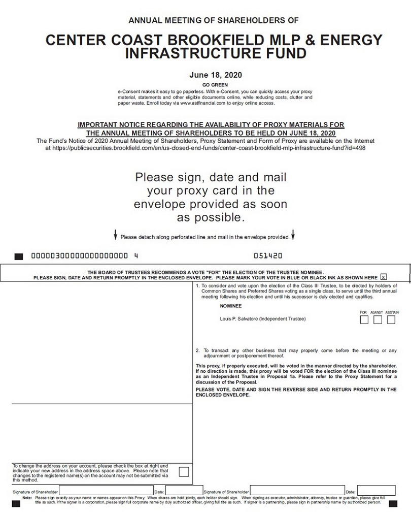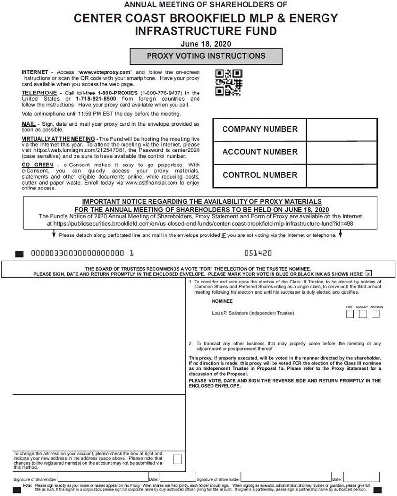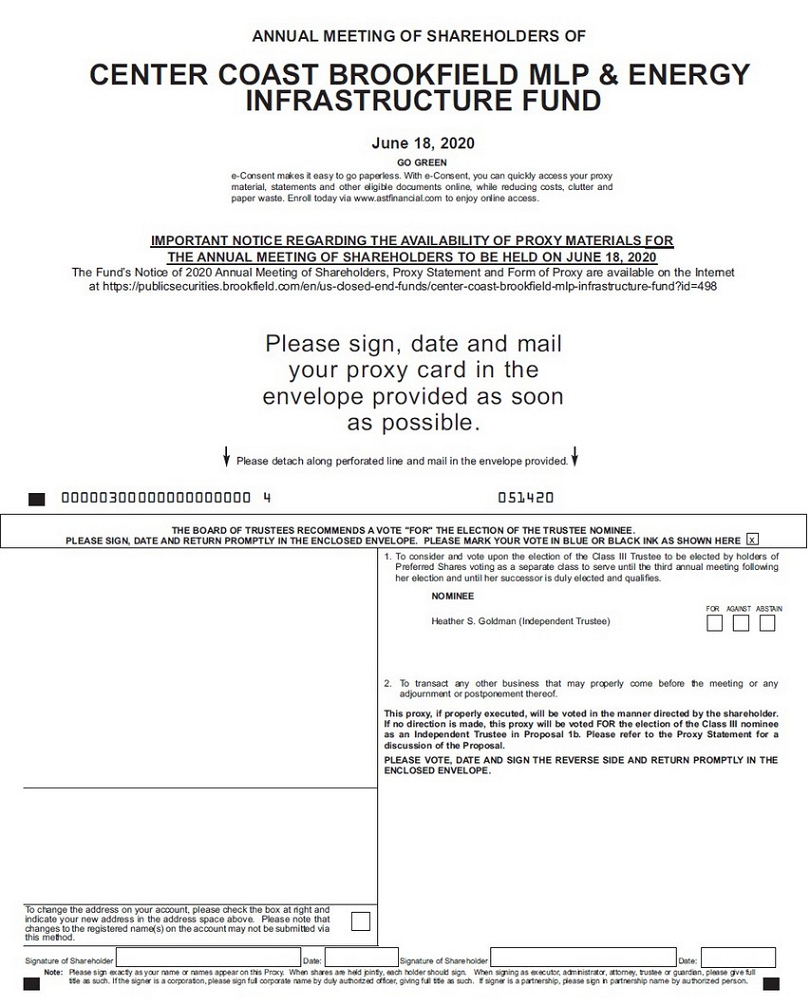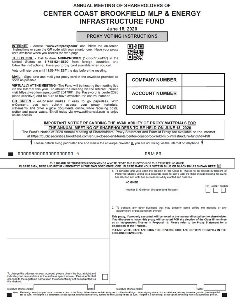 ANNUAL MEETING OF SHAREHOLDERS OF CENTER COAST BROOKFIELD MLP & ENERGY INFRASTRUCTURE FUND June 18, 2020 GO GREEN e-Consent makes it easy to go paperless. With e-Consent, you can quickly access your proxy material, statements and other eligible documents online, while reducing costs, clutter and paper waste. Enroll today via www.astfinancial.com to enjoy online access. IMPORTANT NOTICE REGARDING THE AVAILABILITY OF PROXY MATERIALS FOR THE ANNUAL MEETING OF SHAREHOLDERS TO BE HELD ON JUNE 18, 2020 The Fund’s Notice of 2020 Annual Meeting of Shareholders, Proxy Statement and Form of Proxy are available on the Internet at https://publicsecurities.brookfield.com/en/us-closed-end-funds/center-coast-brookfield-mlp-infrastructure-fund?id=498 Please sign, date and mail your proxy card in the envelope provided as soon as possible. Please detach along perforated line and mail in the envelope provided. 00000300000000000000 4 051420 Note: Please sign exactly as your name or names appear on this Proxy. When shares are held jointly, each holder should sign. When signing as executor, administrator, attorney, trustee or guardian, please give full title as such. If the signer is a corporation, please sign full corporate name by duly authorized officer, giving full title as such. If signer is a partnership, please sign in partnership name by authorized person. THE BOARD OF TRUSTEES RECOMMENDS A VOTE "FOR" THE ELECTION OF THE TRUSTEE NOMINEE. PLEASE SIGN, DATE AND RETURN PROMPTLY IN THE ENCLOSED ENVELOPE. PLEASE MARK YOUR VOTE IN BLUE OR BLACK INK AS SHOWN HERE x 1. To consider and vote upon the election of the Class III Trustee, to be elected by holders of Common Shares and Preferred Shares voting as a single class, to serve until the third annual meeting following his election and until his successor is duly elected and qualifies. NOMINEE FOR AGAINST ABSTAIN Louis P. Salvatore (Independent Trustee) 2. To transact any other business that may properly come before the meeting or any adjournment or postponement thereof. This proxy, if properly executed, will be voted in the manner directed by the shareholder. If no direction is made, this proxy will be voted FOR the election of the Class III nominee as an Independent Trustee in Proposal 1a. Please refer to the Proxy Statement for a discussion of the Proposal. PLEASE VOTE, DATE AND SIGN THE REVERSE SIDE AND RETURN PROMPTLY IN THE ENCLOSED ENVELOPE. To change the address on your account, please check the box at right and indicate your new address in the address space above. Please note that changes to the registered name(s) on the account may not be submitted via this method. Signature of Shareholder Date: Signature of Shareholder Date: