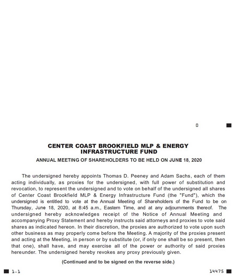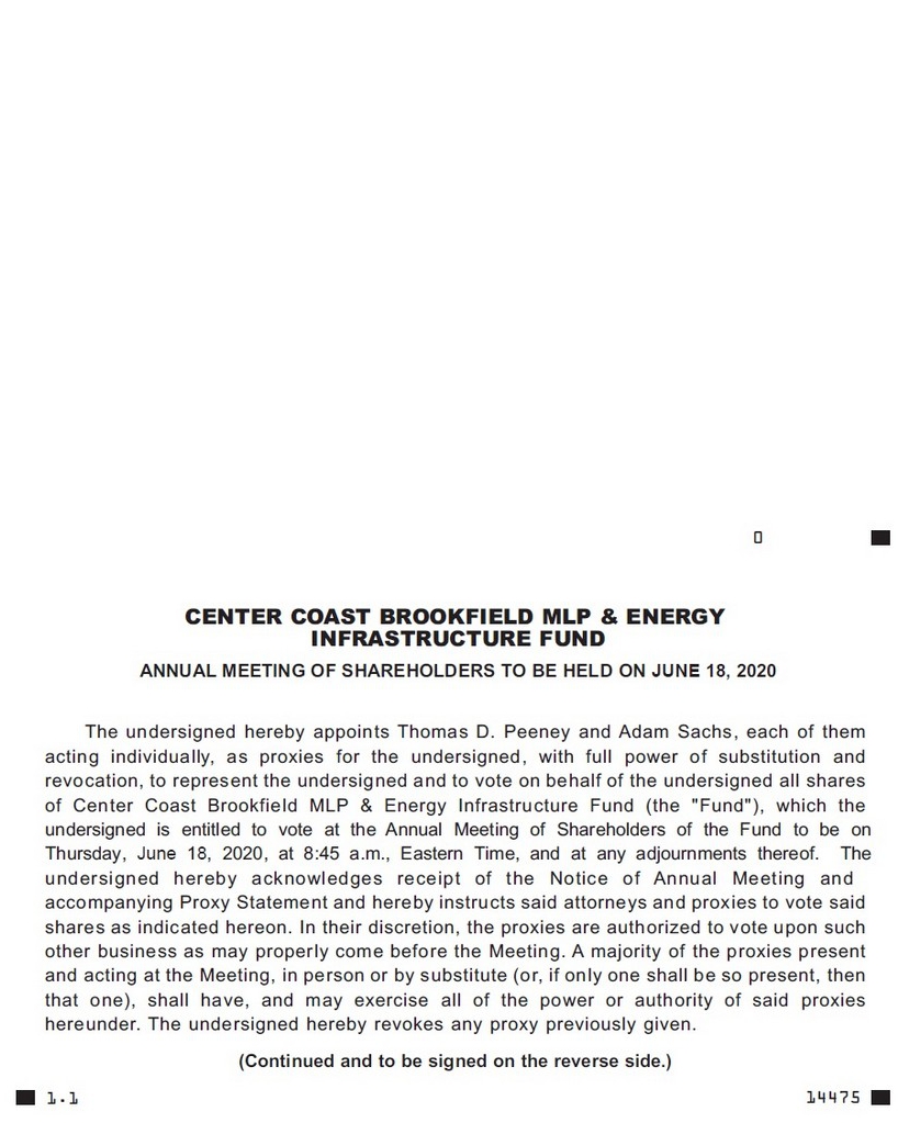 - 0 CENTER COAST BROOKFIELD MLP & ENERGY INFRASTRUCTURE FUND ANNUAL MEETING OF SHAREHOLDERS TO BE HELD ON JUNE 18, 2020 The undersigned hereby appoints Thomas D. Peeney and Adam Sachs, each of them acting individually, as proxies for the undersigned, with full power of substitution and revocation, to represent the undersigned and to vote on behalf of the undersigned all shares of Center Coast Brookfield MLP & Energy Infrastructure Fund (the "Fund"), which the undersigned is entitled to vote at the Annual Meeting of Shareholders of the Fund to be on Thursday, June 18, 2020, at 8:45 a.m., Eastern Time, and at any adjournments thereof. The unde r s i gne d he r eb y ackno wl edge s r ec e i p t o f th e N ot i c e o f A nnua l Meet i n g an d accompanying Proxy Statement and hereby instructs said attorneys and proxies to vote said shares as indicated hereon. In their discretion, the proxies are authorized to vote upon such other business as may properly come before the Meeting. A majority of the proxies present and acting at the Meeting, in person or by substitute (or, if only one shall be so present, then that one), shall have, and may exercise all of the power or authority of said proxies hereunder. The undersigned hereby revokes any proxy previously given. (Continued and to be signed on the reverse side.) 14475 1.1