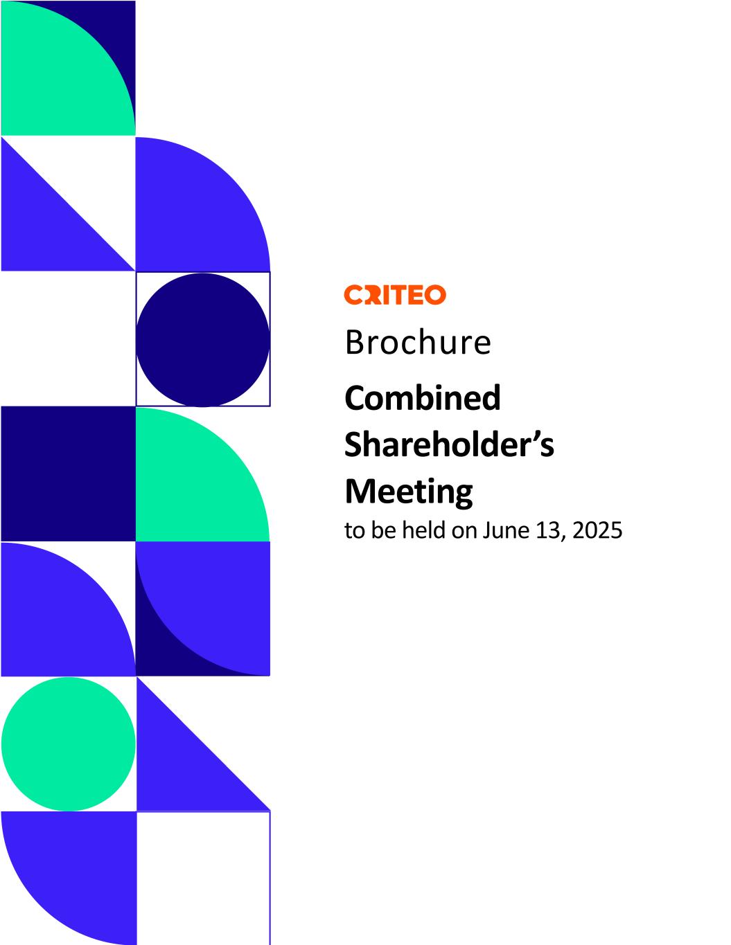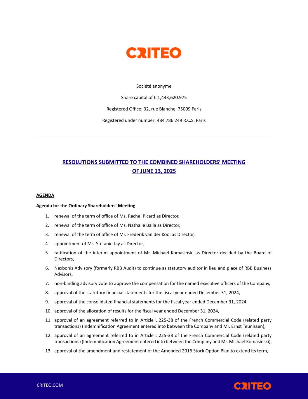CRITEO.COM Société anonyme Share capital of € 1,443,620.975 Registered Office: 32, rue Blanche, 75009 Paris Registered under number: 484 786 249 R.C.S. Paris RESOLUTIONS SUBMITTED TO THE COMBINED SHAREHOLDERS’ MEETING OF JUNE 13, 2025 AGENDA Agenda for the Ordinary Shareholders’ Meeting 1. renewal of the term of office of Ms. Rachel Picard as Director, 2. renewal of the term of office of Ms. Nathalie Balla as Director, 3. renewal of the term of office of Mr. Frederik van der Kooi as Director, 4. appointment of Ms. Stefanie Jay as Director, 5. ratification of the interim appointment of Mr. Michael Komasinski as Director decided by the Board of Directors, 6. Nexbonis Advisory (formerly RBB Audit) to continue as statutory auditor in lieu and place of RBB Business Advisors, 7. non-binding advisory vote to approve the compensation for the named executive officers of the Company, 8. approval of the statutory financial statements for the fiscal year ended December 31, 2024, 9. approval of the consolidated financial statements for the fiscal year ended December 31, 2024, 10. approval of the allocation of results for the fiscal year ended December 31, 2024, 11. approval of an agreement referred to in Article L.225-38 of the French Commercial Code (related party transactions) (Indemnification Agreement entered into between the Company and Mr. Ernst Teunissen), 12. approval of an agreement referred to in Article L.225-38 of the French Commercial Code (related party transactions) (Indemnification Agreement entered into between the Company and Mr. Michael Komasinski), 13. approval of the amendment and restatement of the Amended 2016 Stock Option Plan to extend its term,
