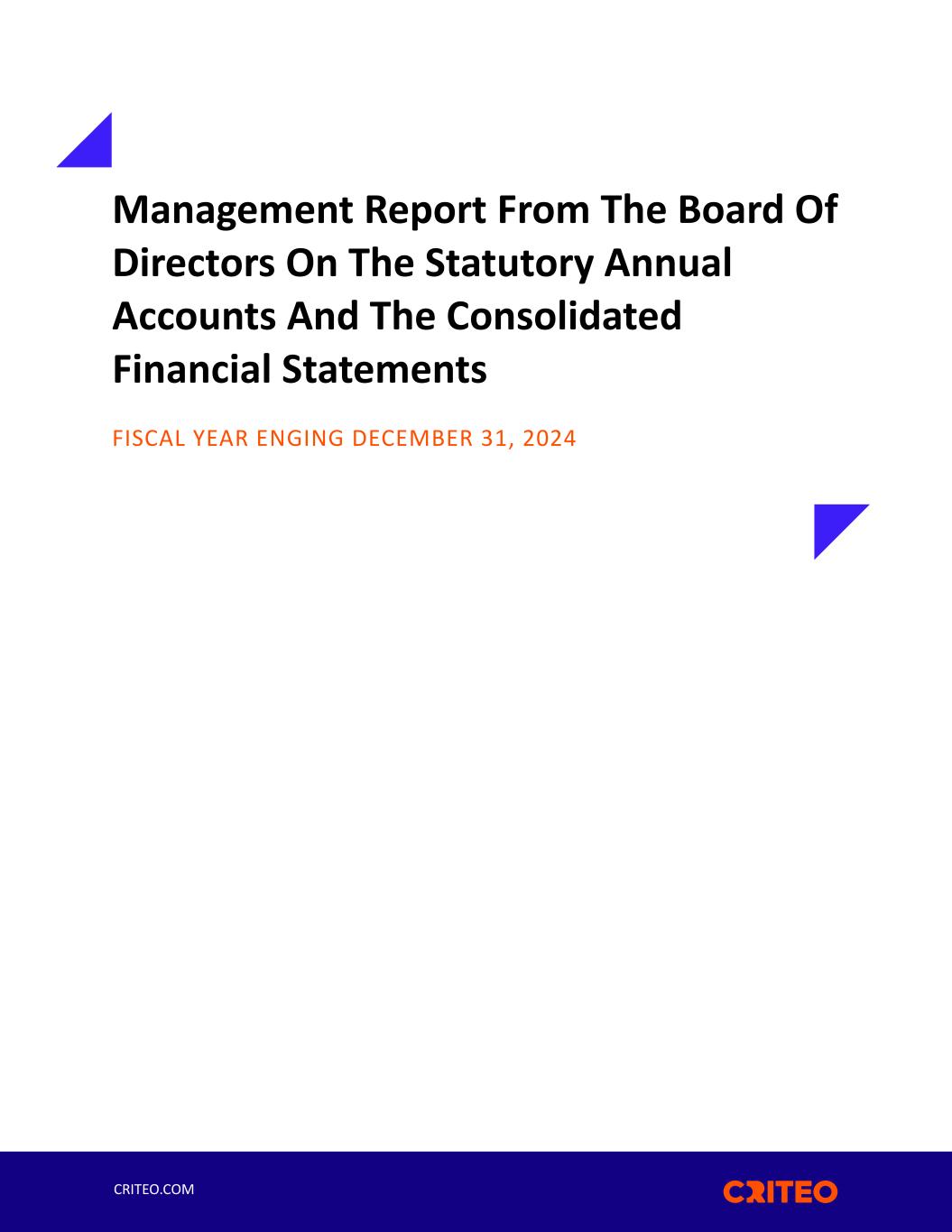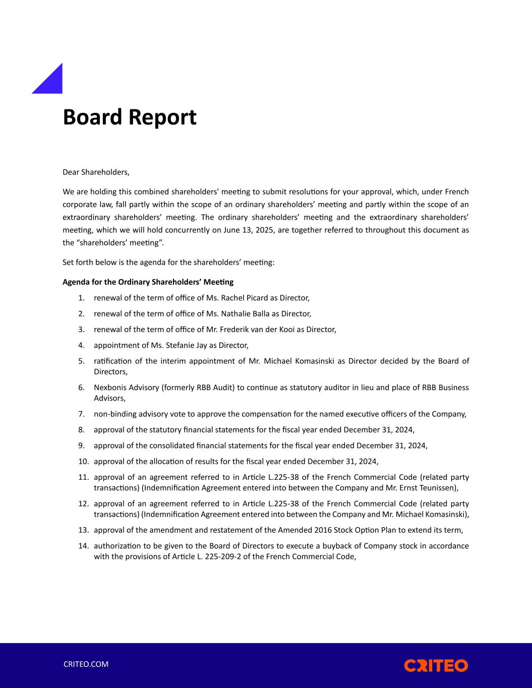 CRITEO.COM Board Report Dear Shareholders, We are holding this combined shareholders' meeting to submit resolutions for your approval, which, under French corporate law, fall partly within the scope of an ordinary shareholders’ meeting and partly within the scope of an extraordinary shareholders’ meeting. The ordinary shareholders’ meeting and the extraordinary shareholders’ meeting, which we will hold concurrently on June 13, 2025, are together referred to throughout this document as the “shareholders’ meeting”. Set forth below is the agenda for the shareholders’ meeting: Agenda for the Ordinary Shareholders’ Meeting 1. renewal of the term of office of Ms. Rachel Picard as Director, 2. renewal of the term of office of Ms. Nathalie Balla as Director, 3. renewal of the term of office of Mr. Frederik van der Kooi as Director, 4. appointment of Ms. Stefanie Jay as Director, 5. ratification of the interim appointment of Mr. Michael Komasinski as Director decided by the Board of Directors, 6. Nexbonis Advisory (formerly RBB Audit) to continue as statutory auditor in lieu and place of RBB Business Advisors, 7. non-binding advisory vote to approve the compensation for the named executive officers of the Company, 8. approval of the statutory financial statements for the fiscal year ended December 31, 2024, 9. approval of the consolidated financial statements for the fiscal year ended December 31, 2024, 10. approval of the allocation of results for the fiscal year ended December 31, 2024, 11. approval of an agreement referred to in Article L.225-38 of the French Commercial Code (related party transactions) (Indemnification Agreement entered into between the Company and Mr. Ernst Teunissen), 12. approval of an agreement referred to in Article L.225-38 of the French Commercial Code (related party transactions) (Indemnification Agreement entered into between the Company and Mr. Michael Komasinski), 13. approval of the amendment and restatement of the Amended 2016 Stock Option Plan to extend its term, 14. authorization to be given to the Board of Directors to execute a buyback of Company stock in accordance with the provisions of Article L. 225-209-2 of the French Commercial Code,