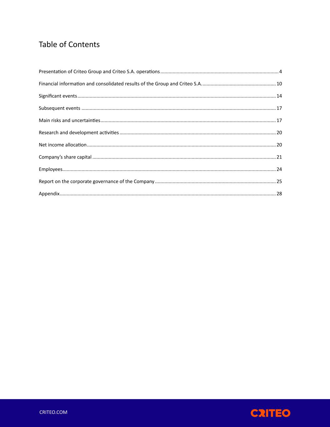 CRITEO.COM Table of Contents Presentation of Criteo Group and Criteo S.A. operations ....................................................................................... 4 Financial information and consolidated results of the Group and Criteo S.A. ...................................................... 10 Significant events .................................................................................................................................................. 14 Subsequent events ............................................................................................................................................... 17 Main risks and uncertainties ................................................................................................................................. 17 Research and development activities ................................................................................................................... 20 Net income allocation ........................................................................................................................................... 20 Company’s share capital ....................................................................................................................................... 21 Employees............................................................................................................................................................. 24 Report on the corporate governance of the Company ......................................................................................... 25 Appendix ............................................................................................................................................................... 28