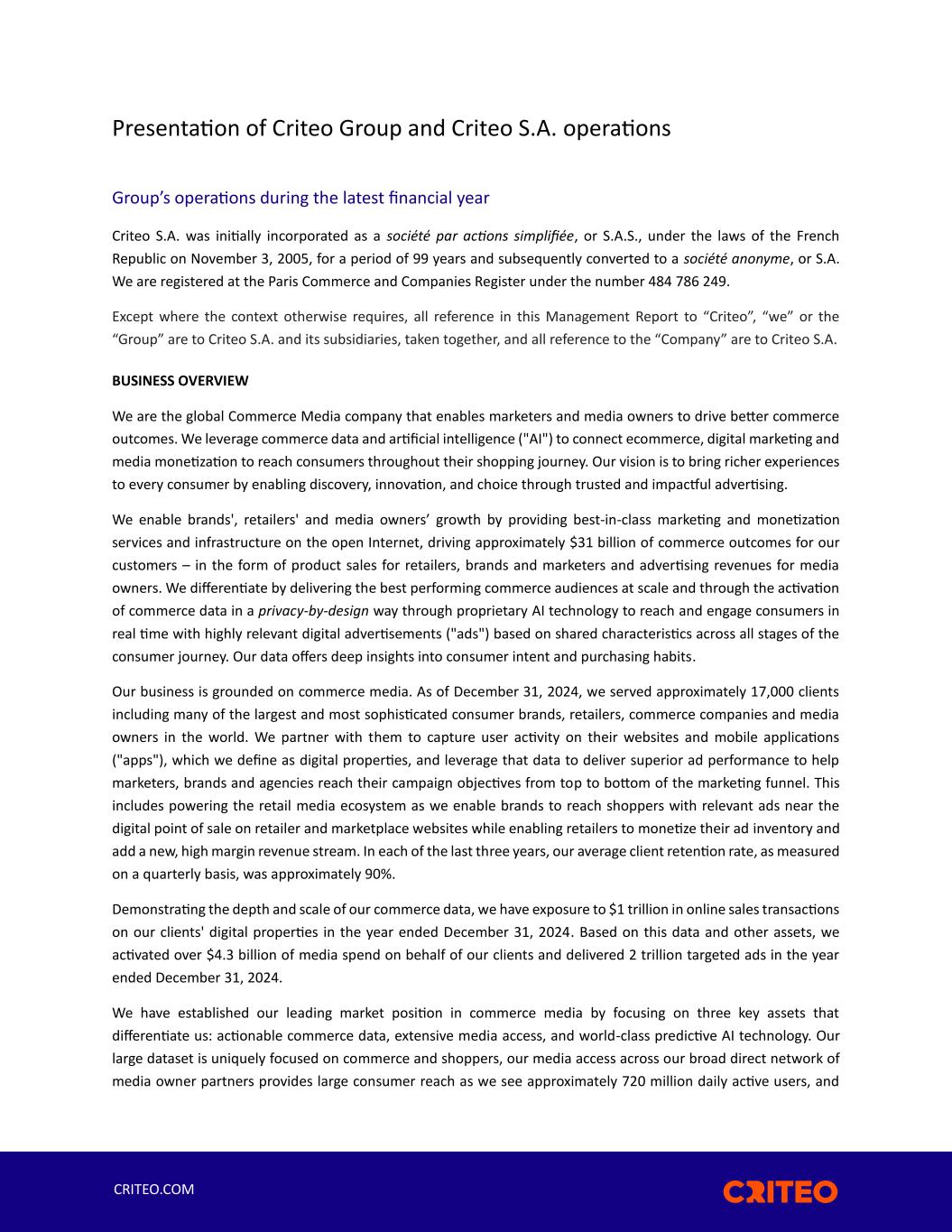CRITEO.COM Presentation of Criteo Group and Criteo S.A. operations Group’s operations during the latest financial year Criteo S.A. was initially incorporated as a société par actions simplifiée, or S.A.S., under the laws of the French Republic on November 3, 2005, for a period of 99 years and subsequently converted to a société anonyme, or S.A. We are registered at the Paris Commerce and Companies Register under the number 484 786 249. Except where the context otherwise requires, all reference in this Management Report to “Criteo”, “we” or the “Group” are to Criteo S.A. and its subsidiaries, taken together, and all reference to the “Company” are to Criteo S.A. BUSINESS OVERVIEW We are the global Commerce Media company that enables marketers and media owners to drive better commerce outcomes. We leverage commerce data and artificial intelligence ("AI") to connect ecommerce, digital marketing and media monetization to reach consumers throughout their shopping journey. Our vision is to bring richer experiences to every consumer by enabling discovery, innovation, and choice through trusted and impactful advertising. We enable brands', retailers' and media owners’ growth by providing best-in-class marketing and monetization services and infrastructure on the open Internet, driving approximately $31 billion of commerce outcomes for our customers – in the form of product sales for retailers, brands and marketers and advertising revenues for media owners. We differentiate by delivering the best performing commerce audiences at scale and through the activation of commerce data in a privacy-by-design way through proprietary AI technology to reach and engage consumers in real time with highly relevant digital advertisements ("ads") based on shared characteristics across all stages of the consumer journey. Our data offers deep insights into consumer intent and purchasing habits. Our business is grounded on commerce media. As of December 31, 2024, we served approximately 17,000 clients including many of the largest and most sophisticated consumer brands, retailers, commerce companies and media owners in the world. We partner with them to capture user activity on their websites and mobile applications ("apps"), which we define as digital properties, and leverage that data to deliver superior ad performance to help marketers, brands and agencies reach their campaign objectives from top to bottom of the marketing funnel. This includes powering the retail media ecosystem as we enable brands to reach shoppers with relevant ads near the digital point of sale on retailer and marketplace websites while enabling retailers to monetize their ad inventory and add a new, high margin revenue stream. In each of the last three years, our average client retention rate, as measured on a quarterly basis, was approximately 90%. Demonstrating the depth and scale of our commerce data, we have exposure to $1 trillion in online sales transactions on our clients' digital properties in the year ended December 31, 2024. Based on this data and other assets, we activated over $4.3 billion of media spend on behalf of our clients and delivered 2 trillion targeted ads in the year ended December 31, 2024. We have established our leading market position in commerce media by focusing on three key assets that differentiate us: actionable commerce data, extensive media access, and world-class predictive AI technology. Our large dataset is uniquely focused on commerce and shoppers, our media access across our broad direct network of media owner partners provides large consumer reach as we see approximately 720 million daily active users, and